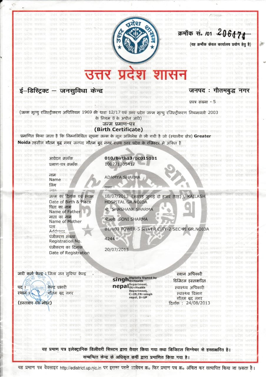 | Father's Name | Shashank Sharma | Gender | Male | Year of Birth | 2013 |
