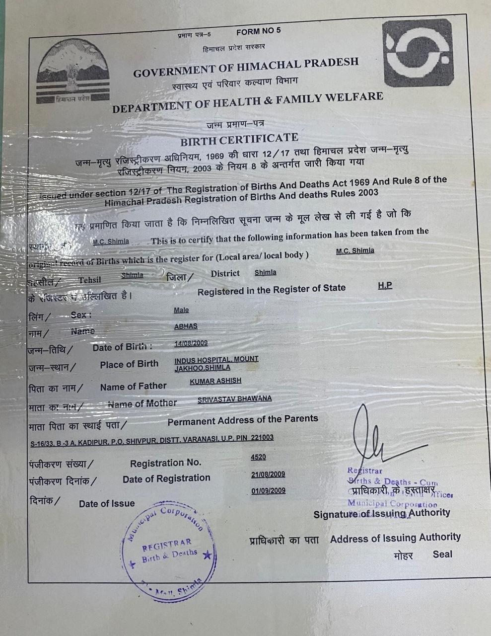 | Father's Name | Ashish Kumar | Gender | Male | Date of Birth | 14-08-2009 |