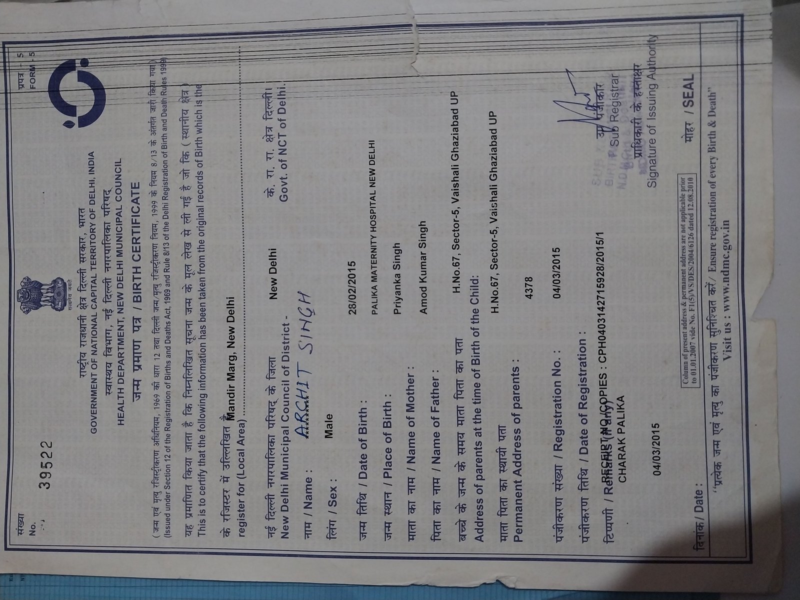 | Father's Name | Amod Kumar | Gender | Male | Date of Birth | 28-02-2015 |