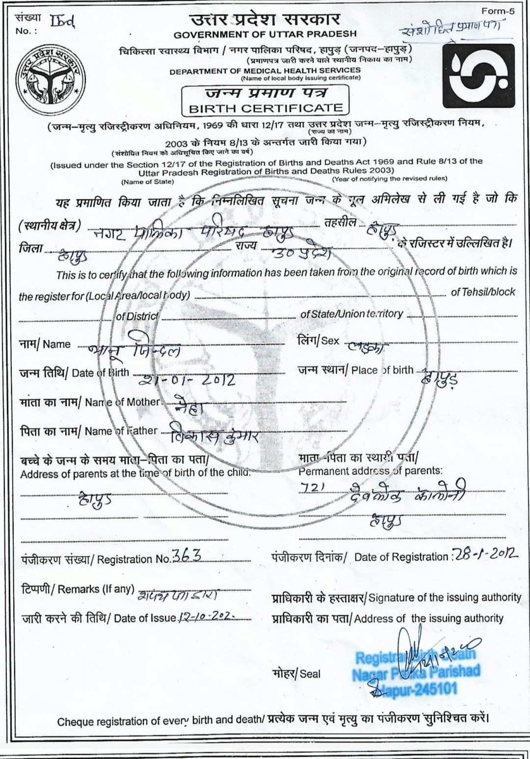 | Father's Name | Vikas Kumar | Gender | Male | Date of Birth | 21-01-2012 |