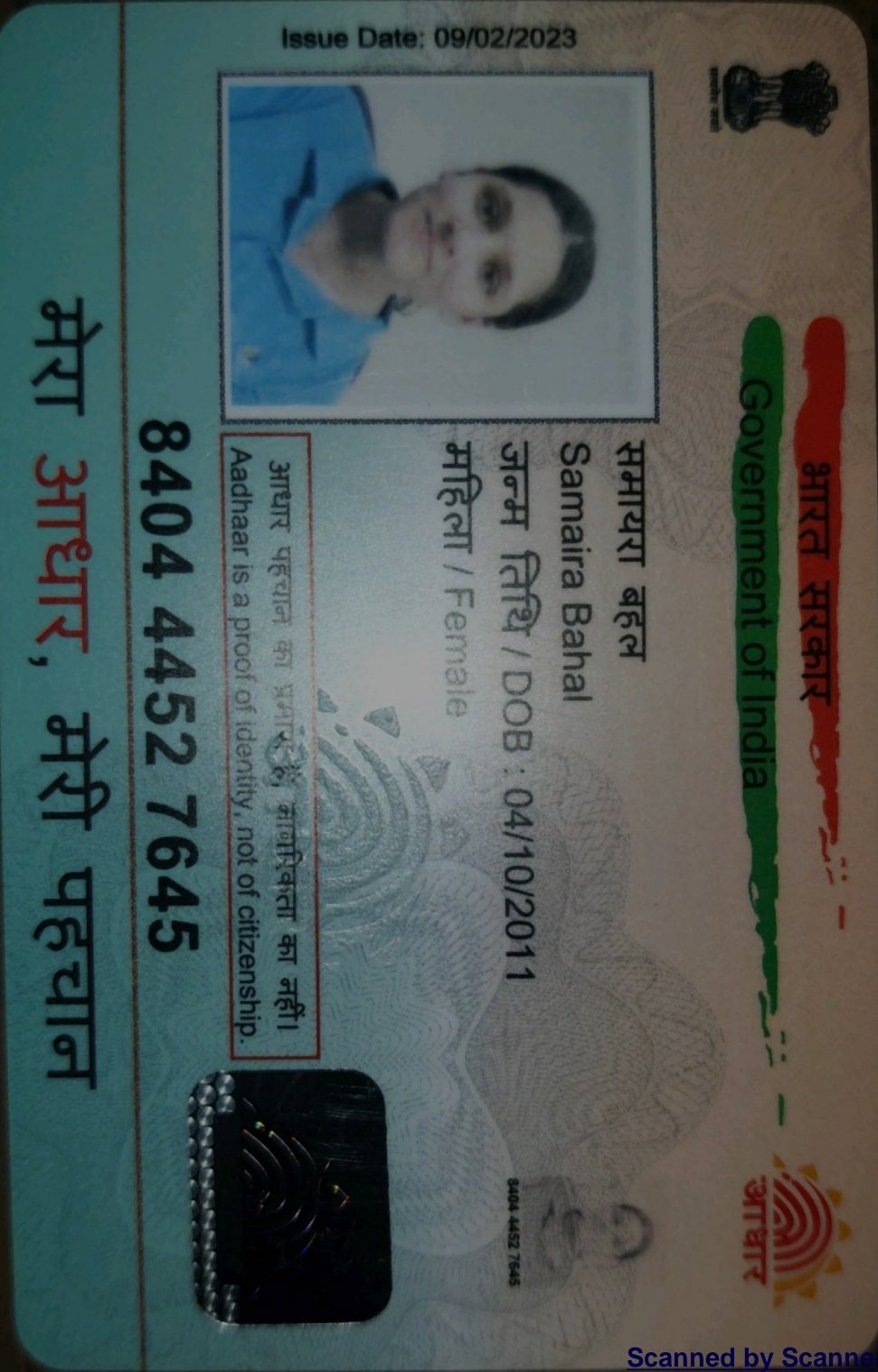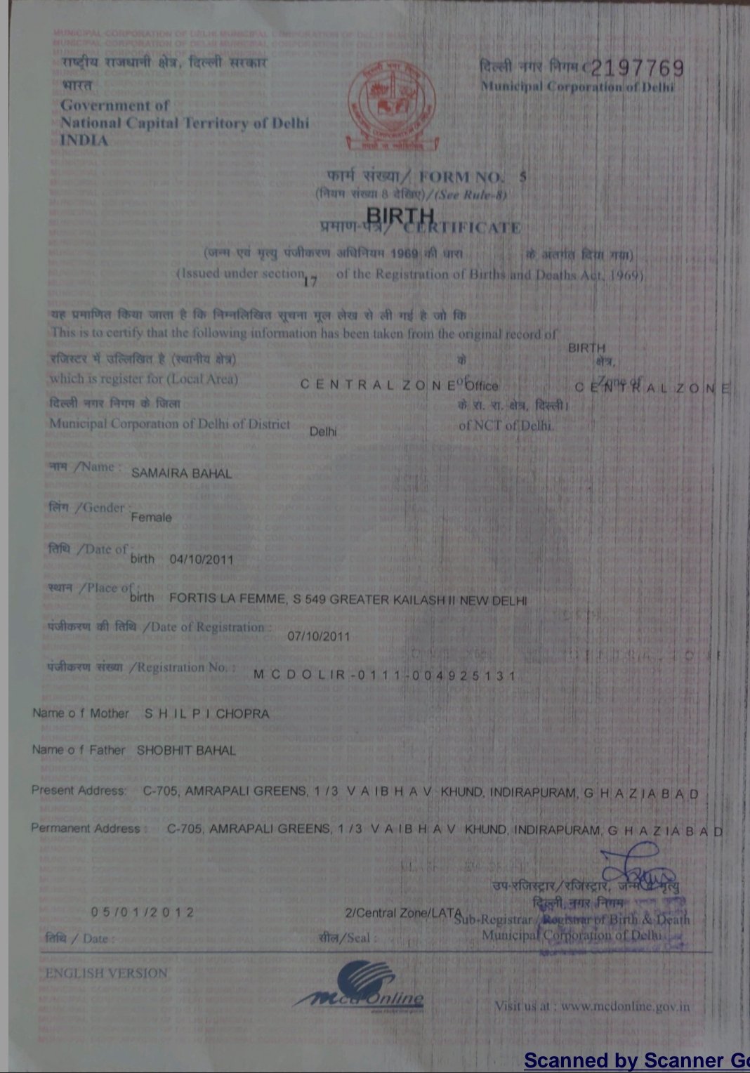 | Father's Name | Shobhit Bahal | Gender | Female | Date of Birth | 04-10-2011 |