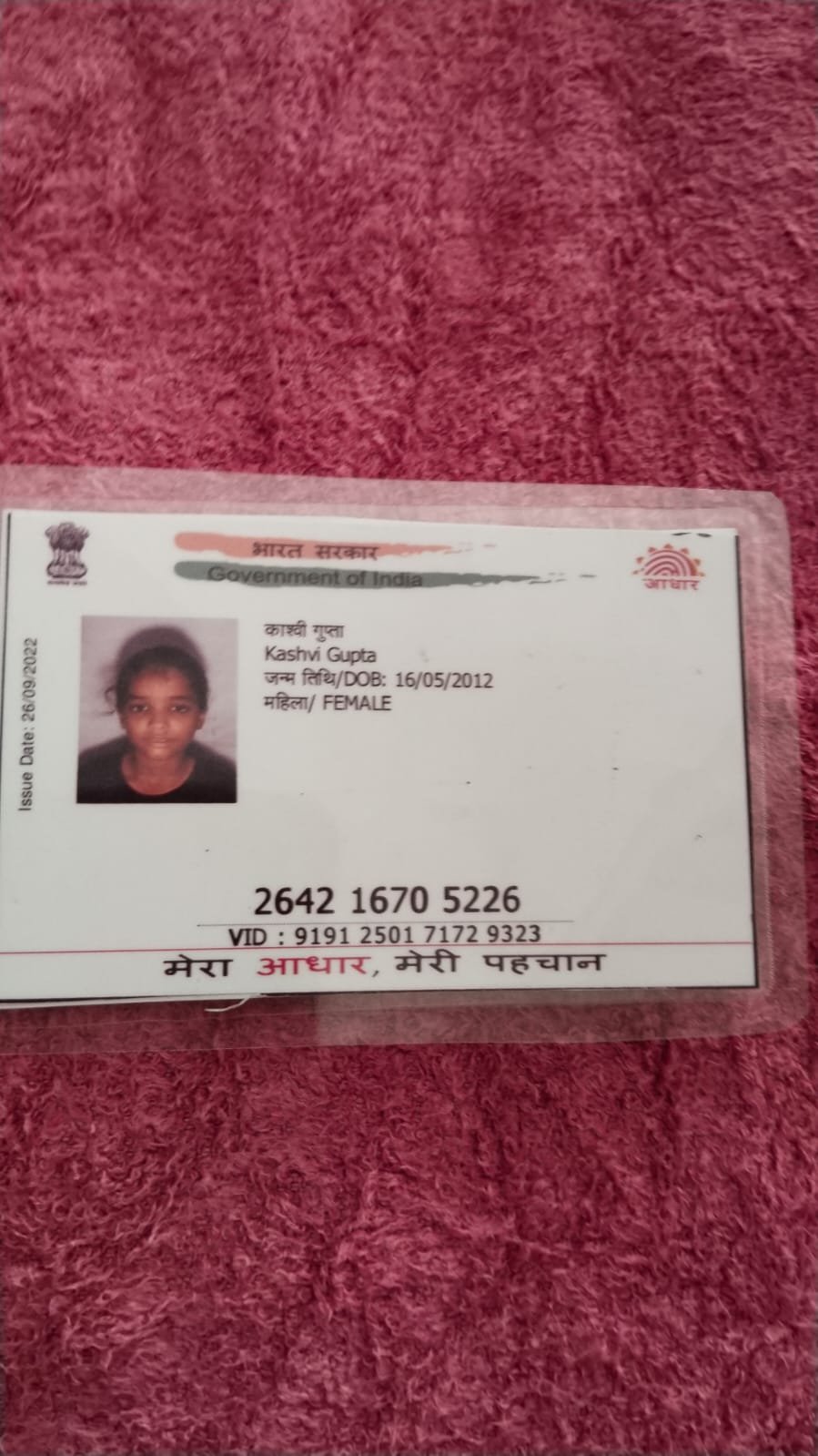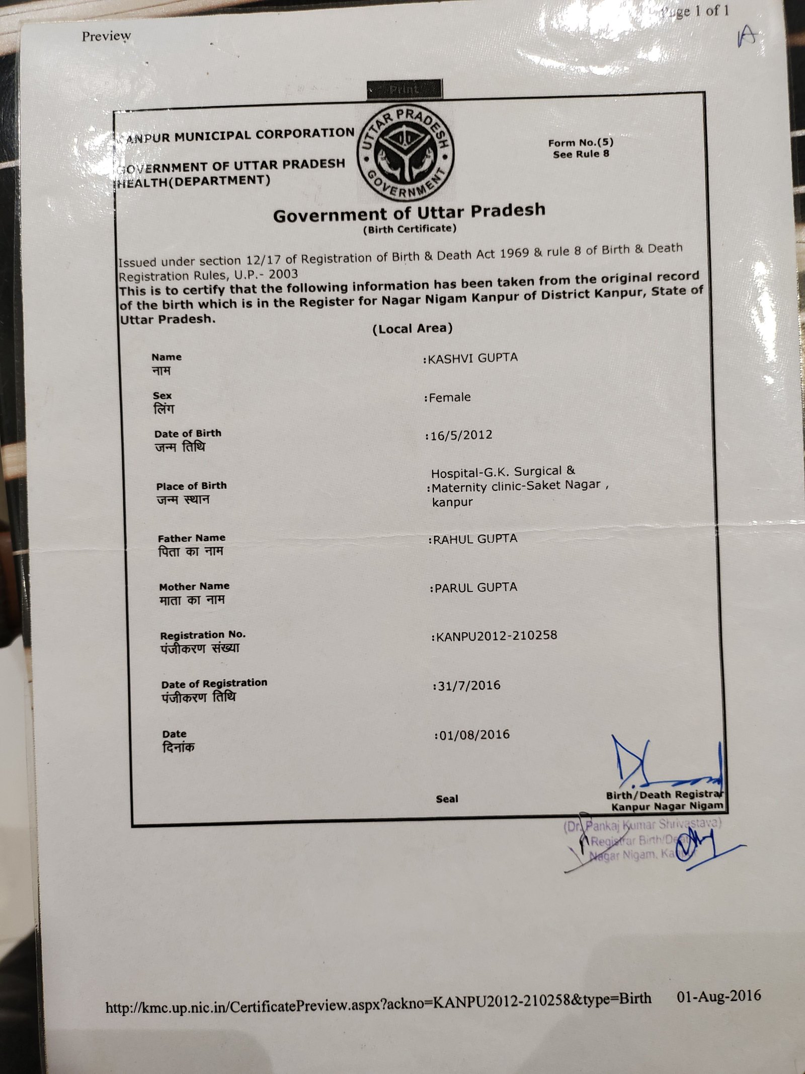| Father's Name | Rahul Gupta | Gender | Female | Date of Birth | 16-05-2012 |