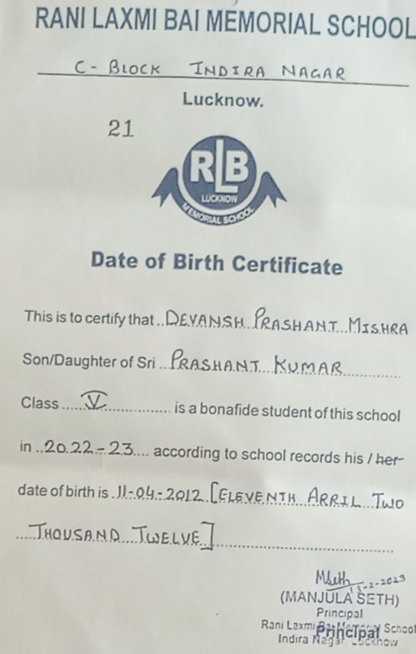 | Father's Name | Prashant | Gender | Male | Date of Birth | 11-04-2012 |