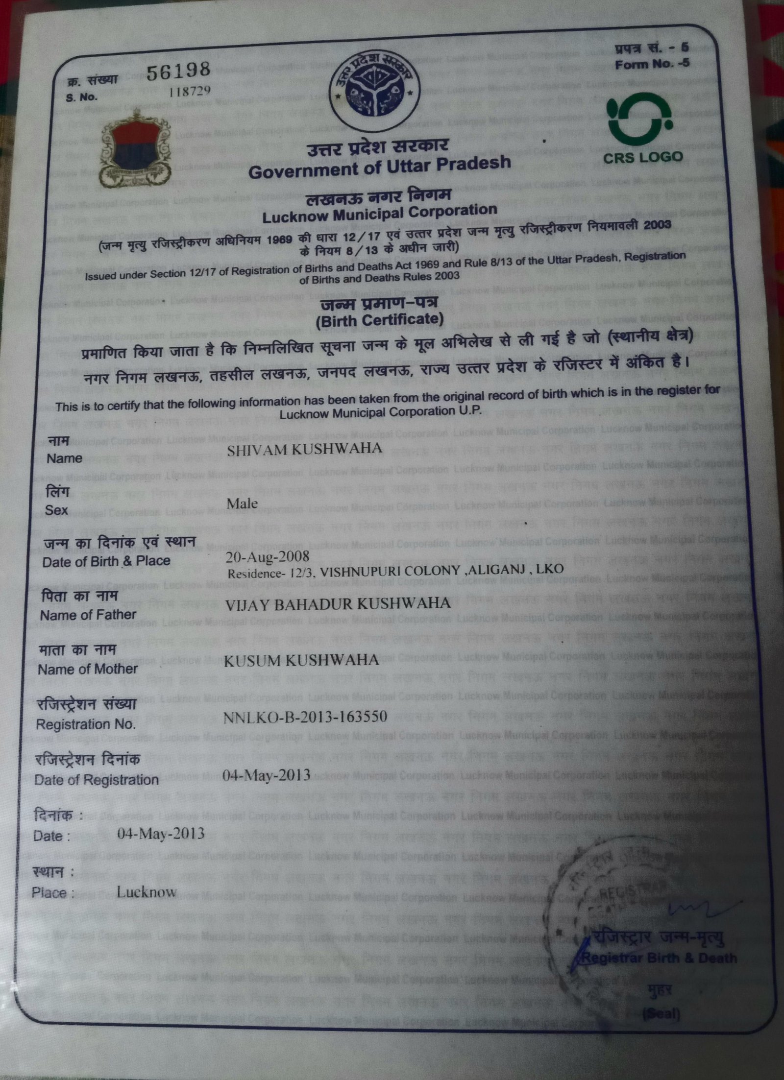 | Father's Name | Mr Vijay bahadur kushwaha | Gender | Male | Date of Birth | 20-08-2008 |
