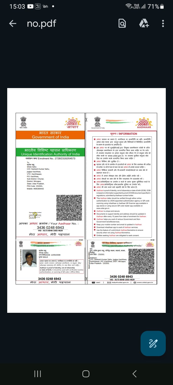 | Father's Name | Santosh Kumar Sahu | Gender | Male | Date of Birth | 12-05-2008 |