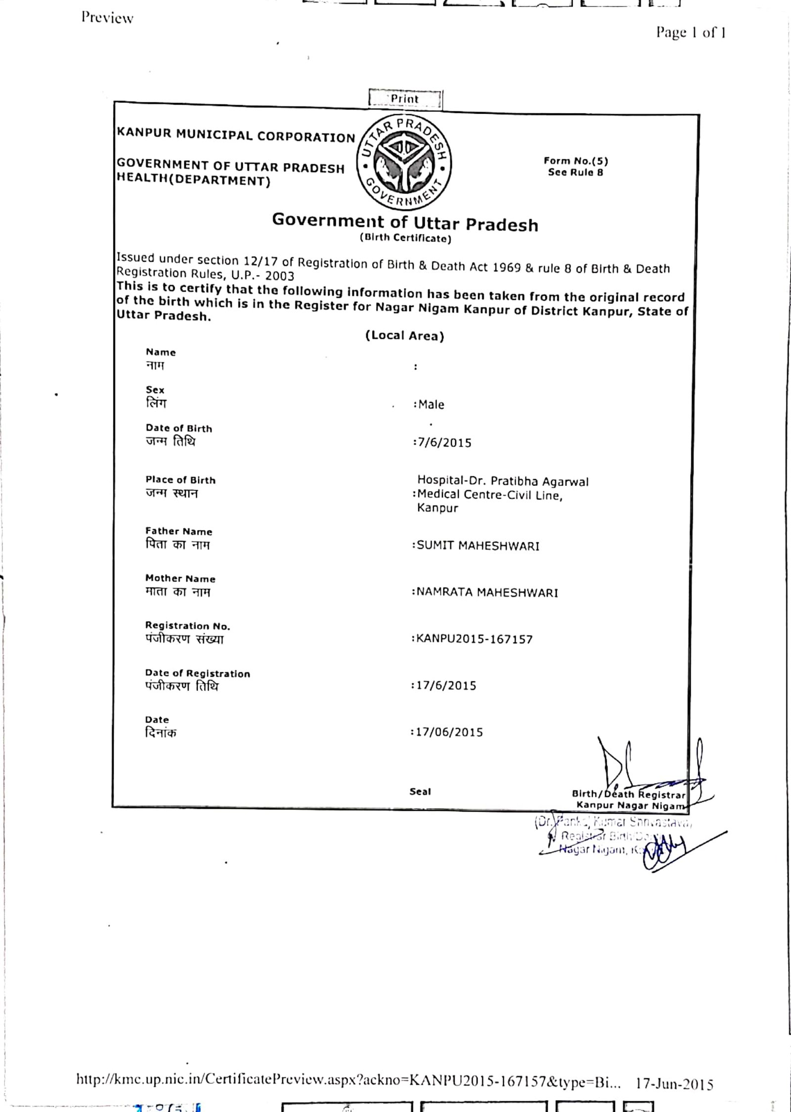 | Father's Name | Sumit Maheshwari | Gender | Male | Date of Birth | 07-06-2015 |