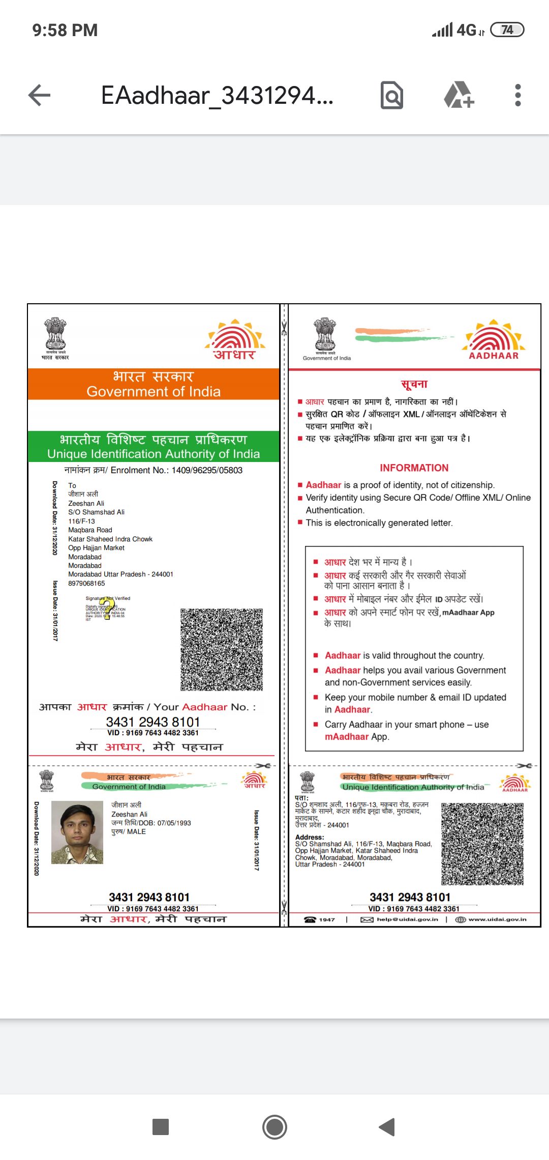 | Father's Name | Shamshad Ali | Gender | Male | Date of Birth | 07-05-1993 |