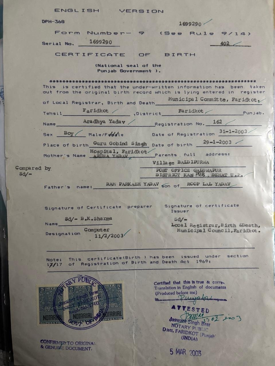 | Father's Name | Ram Prakash Yadav | Gender | Male | Date of Birth | 29-01-2003 |