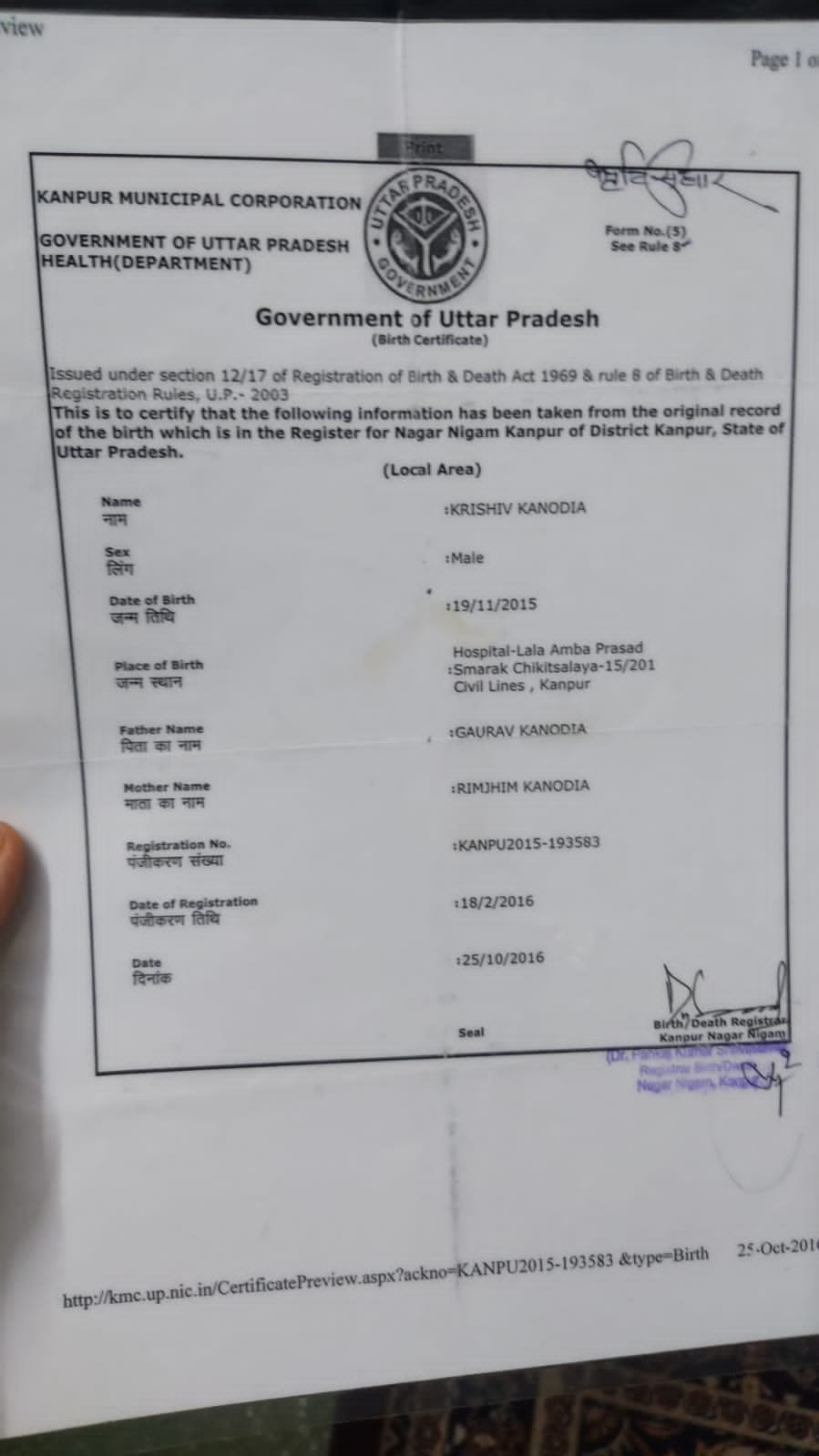 | Father's Name | Gaurav Kanodia | Gender | Male | Date of Birth | 19-11-2015 |