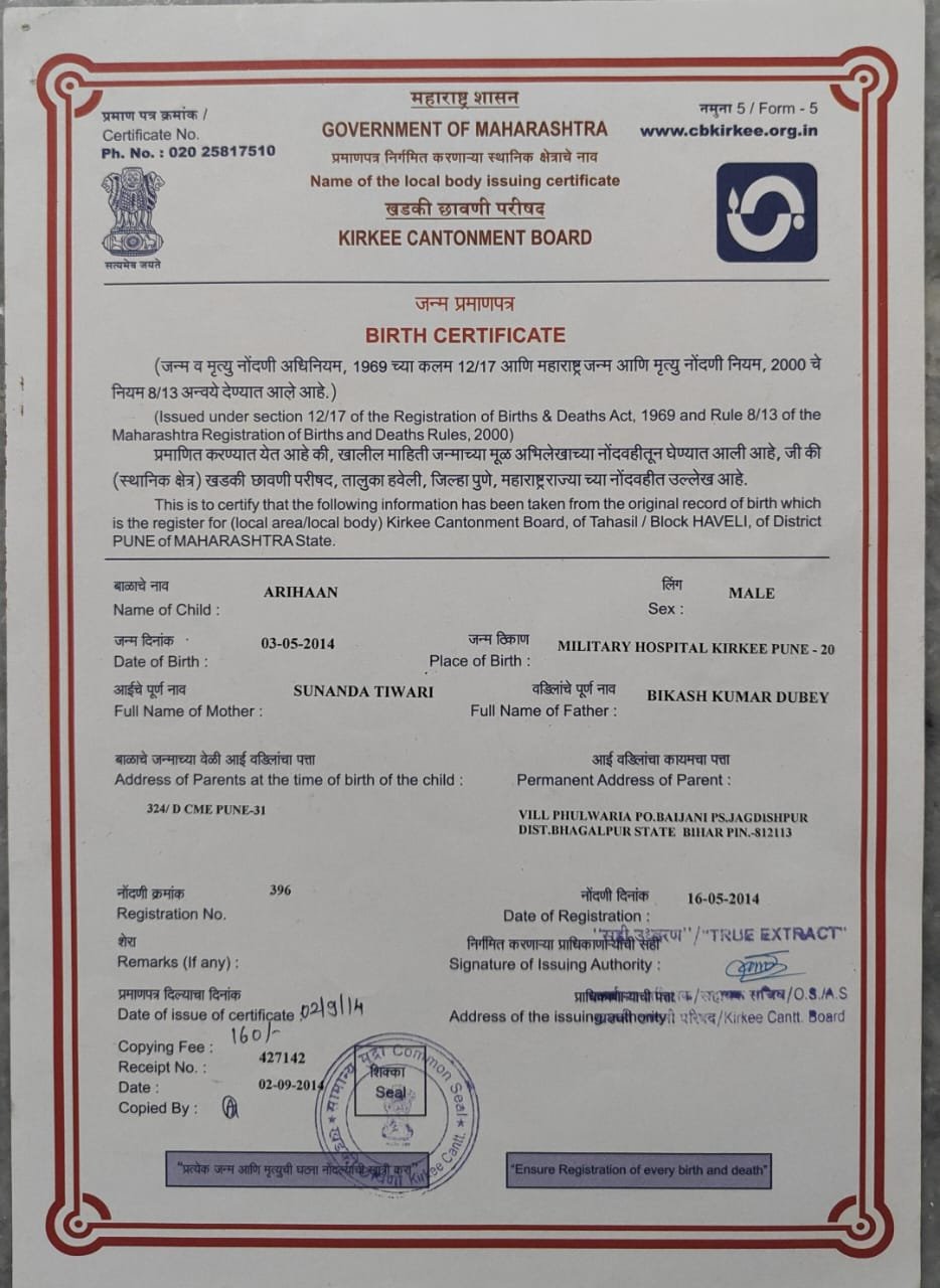 | Father's Name | Late Capt Bikash Kumar Dubey | Gender | Male | Date of Birth | 03-05-2014 |