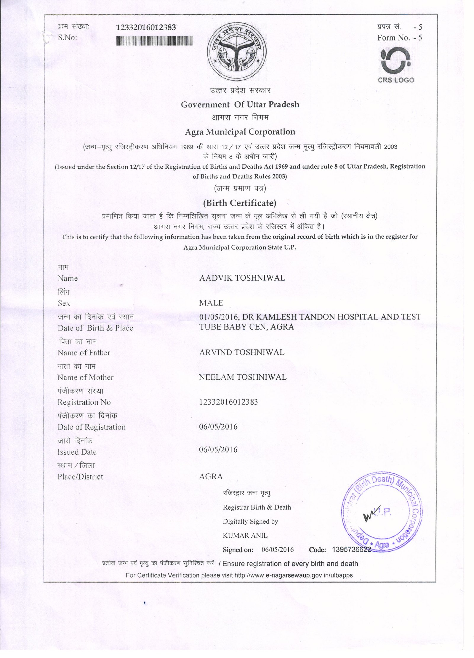 | Father's Name | ARVIND TOSHNIWAL | Gender | Male | Date of Birth | 01-05-2016 |