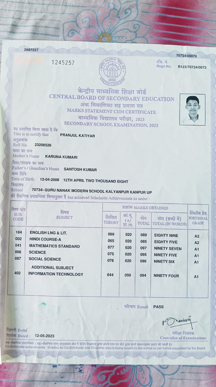 | Father's Name | Santosh kumar | Gender | Male | Date of Birth | 12-04-2008 |