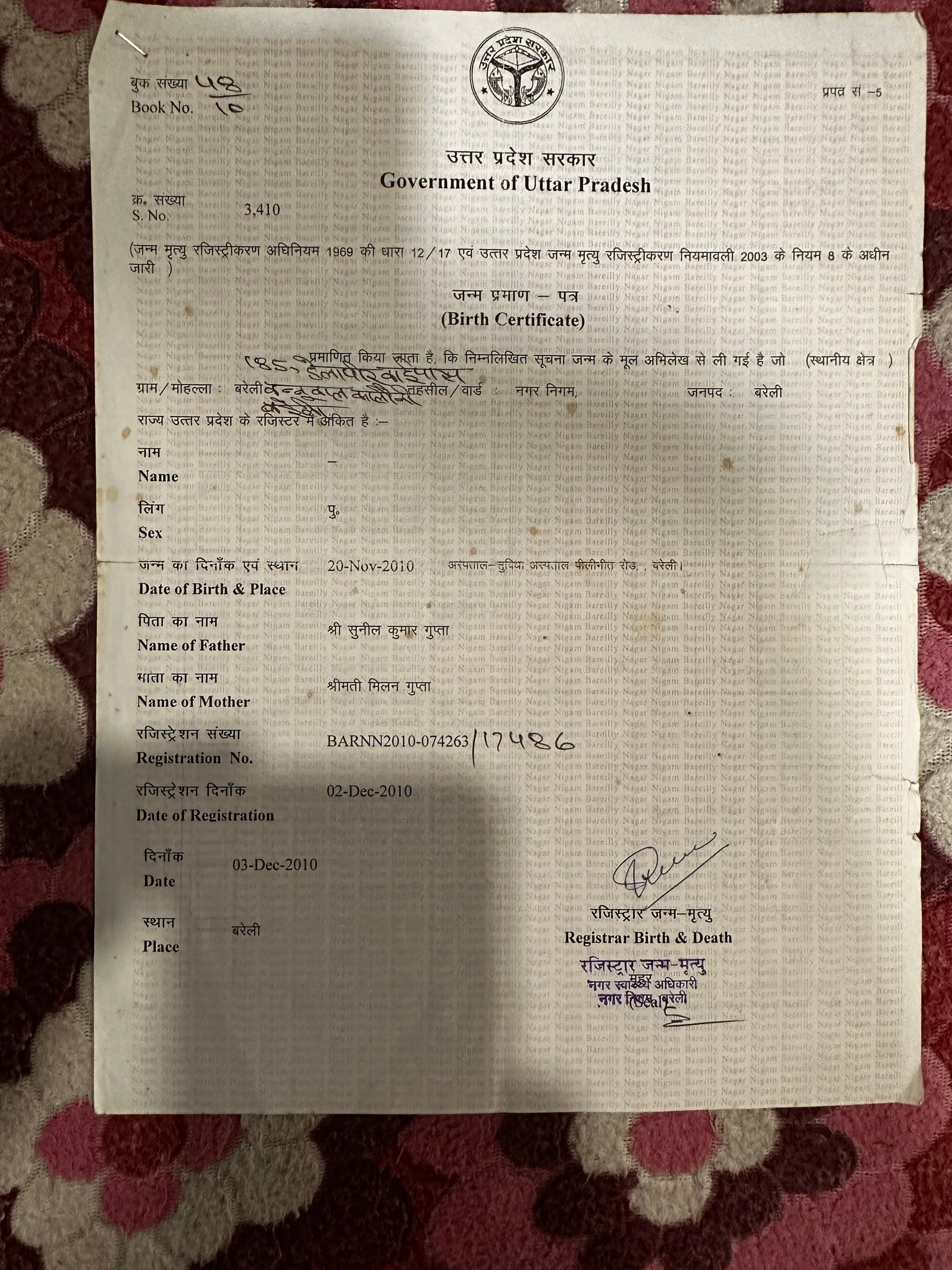 | Father's Name | Sunil kumar gupta | Gender | Male | Date of Birth | 20-11-2010 |