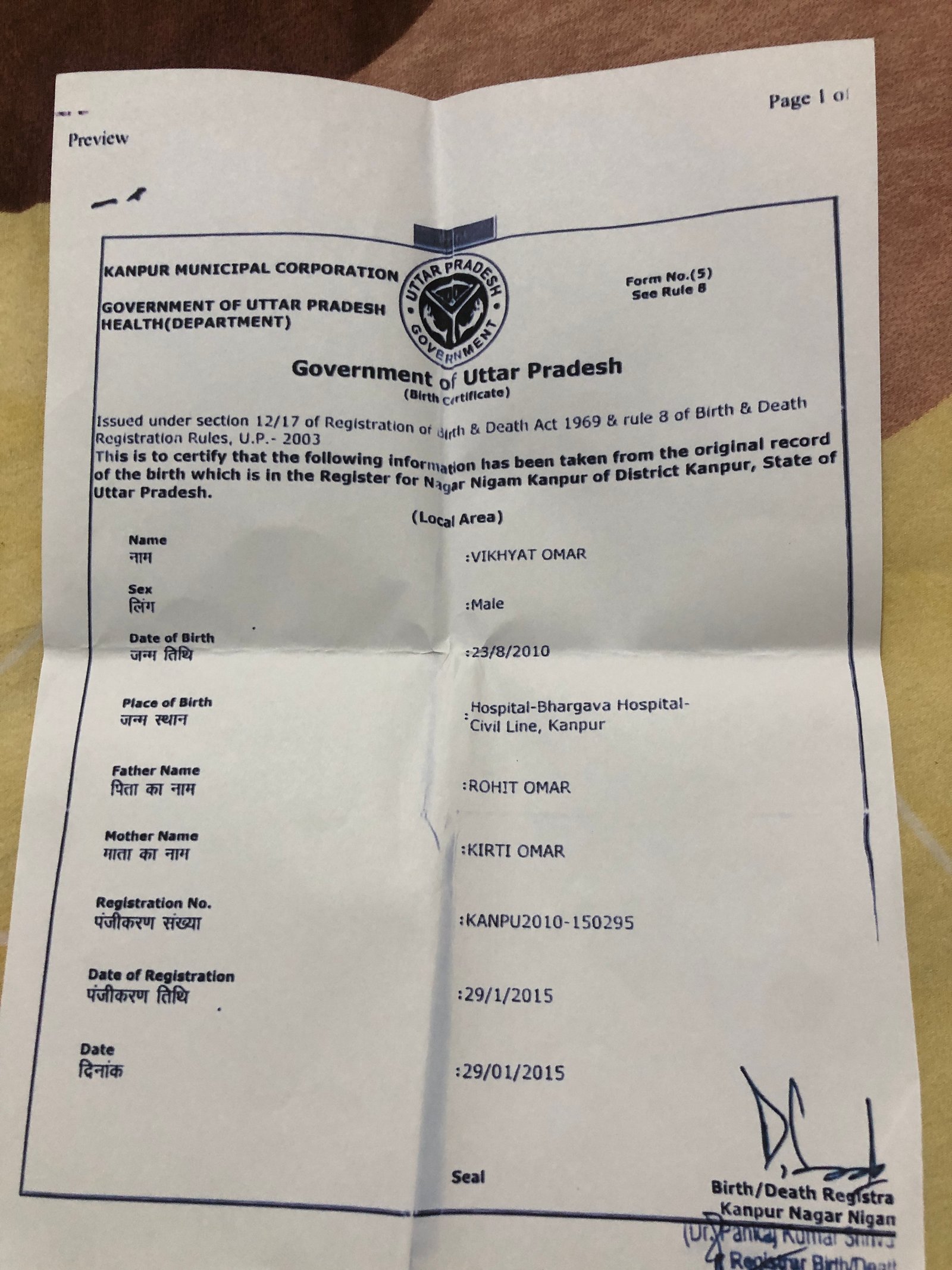 | Father's Name | Rohit Omar | Gender | Male | Date of Birth | 23-08-2010 |
