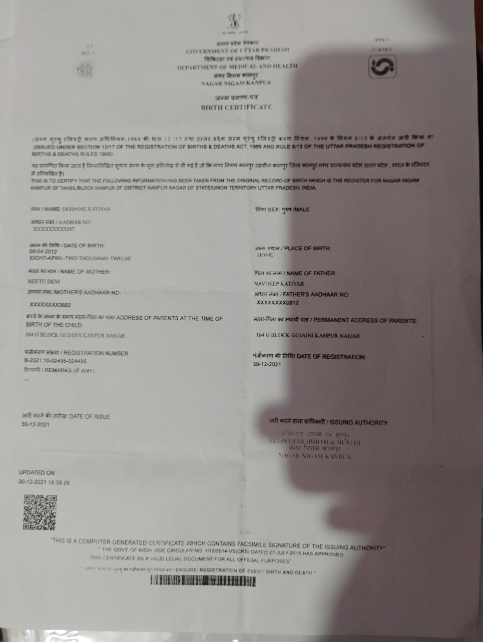| Father's Name | Mr . Navdeep Katiyar | Gender | Male | Date of Birth | 08-04-2012 |