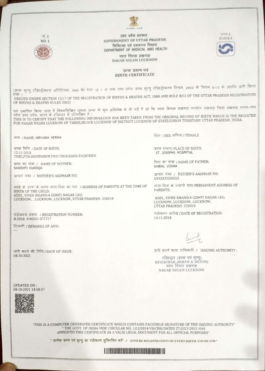| Father's Name | Aviral Verma | Gender | Female | Date of Birth | 12-11-2018 |