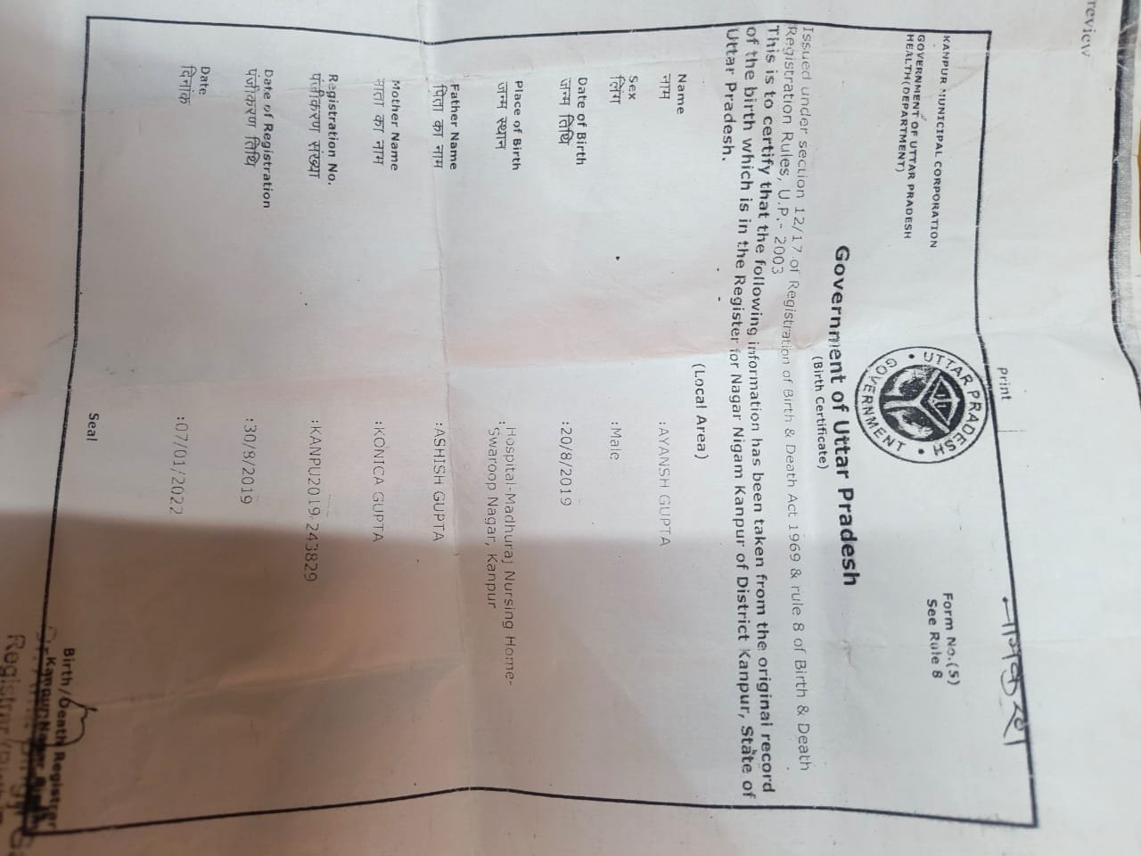 | Father's Name | AShish Gupta | Gender | Male | Date of Birth | 20-08-2019 |