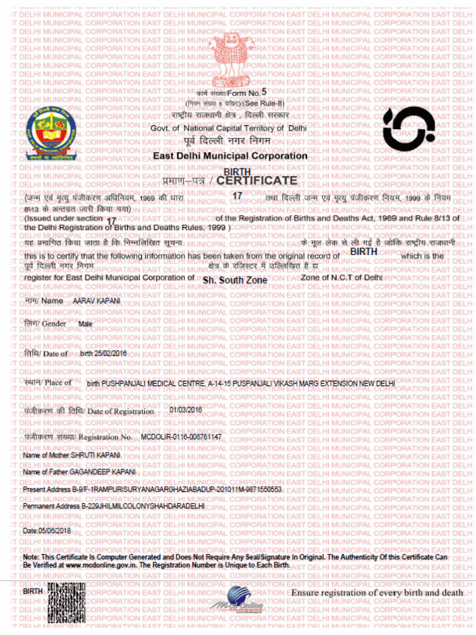 | Father's Name | Gagandeep Kapani | Gender | Male | Date of Birth | 25-02-2016 |