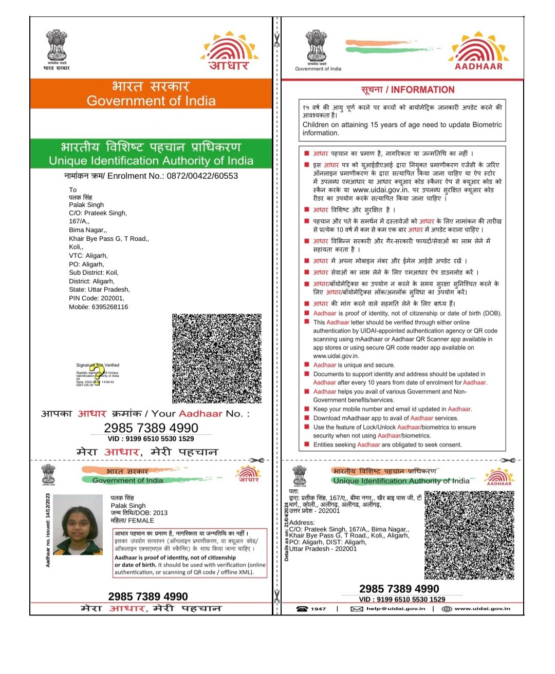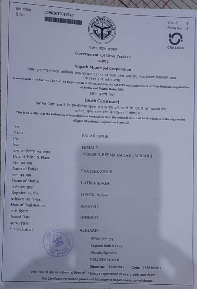 | Father's Name | Prateek Singh | Gender | Female | Date of Birth | 06-03-2013 |