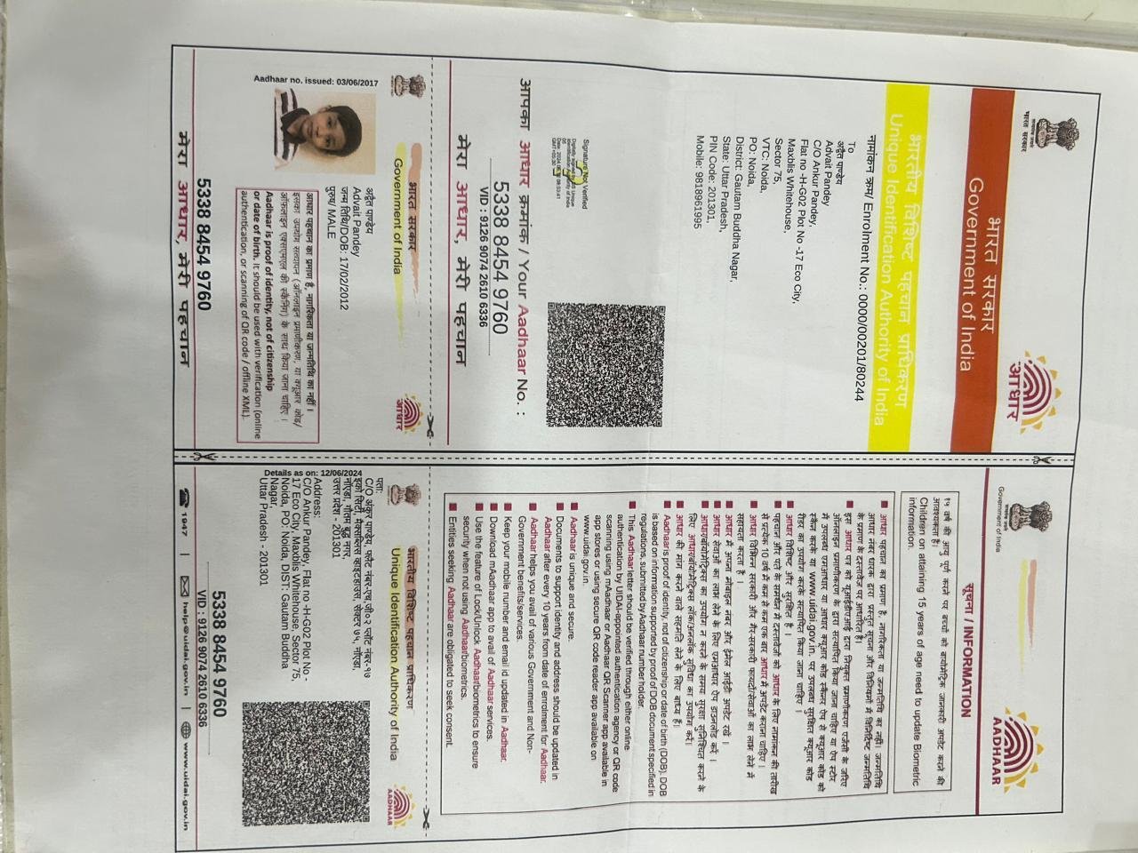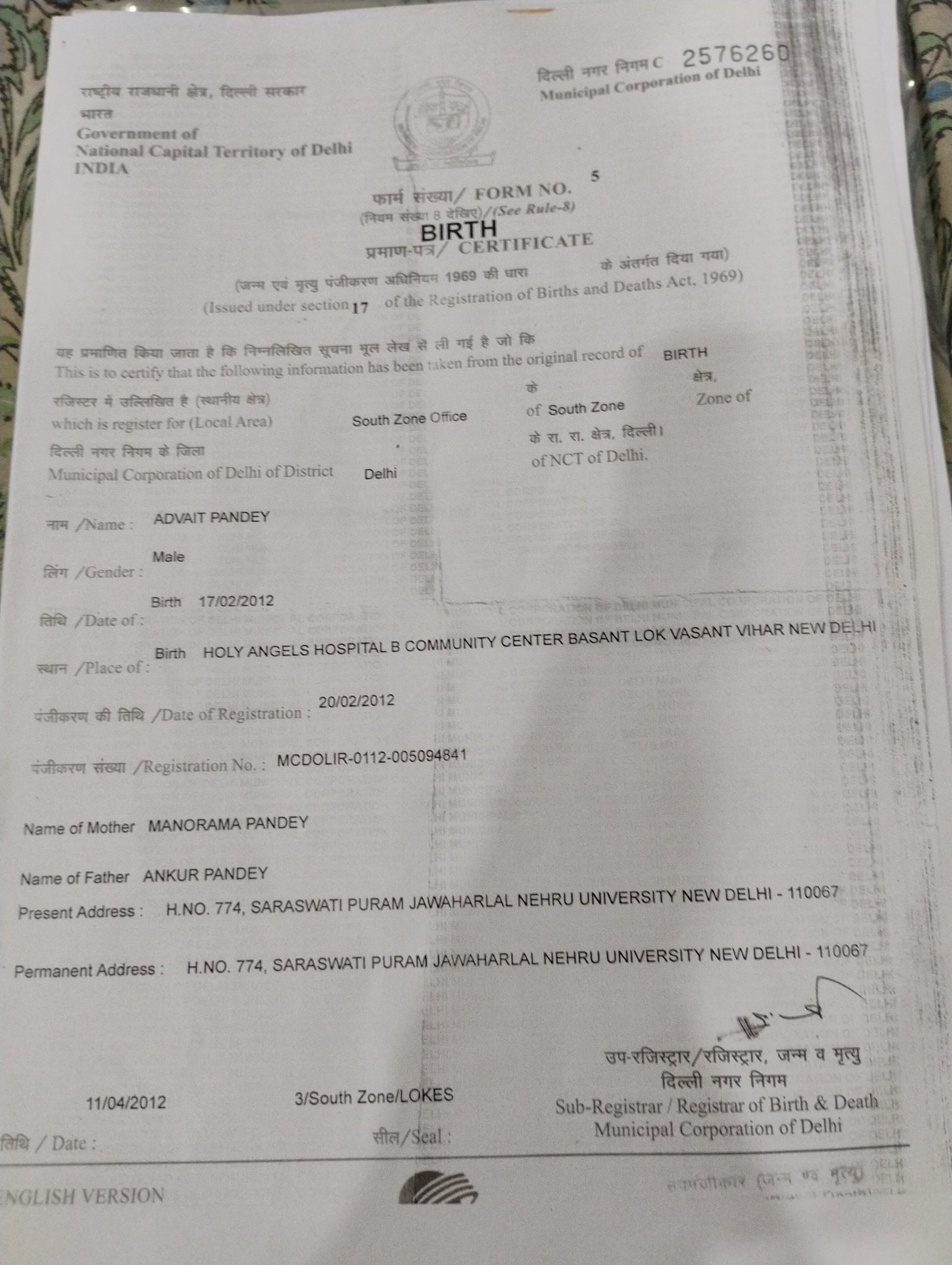 | Father's Name | Ankur Pandey | Gender | Male | Date of Birth | 17-02-2012 |