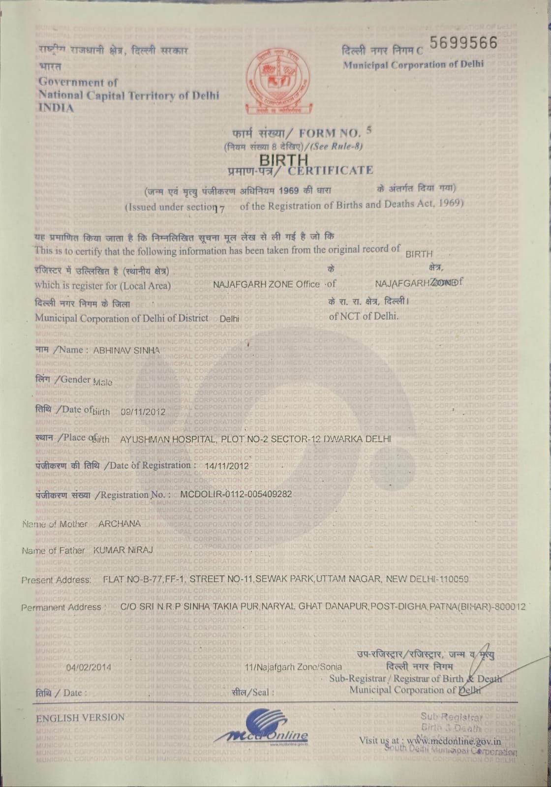 | Father's Name | Kumar Niraj | Gender | Male | Date of Birth | 09-11-2006 |