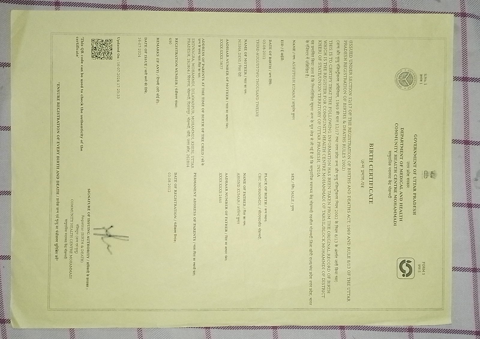 | Father's Name | Arvind Kumar | Gender | Male | Date of Birth | 03-08-2012 |