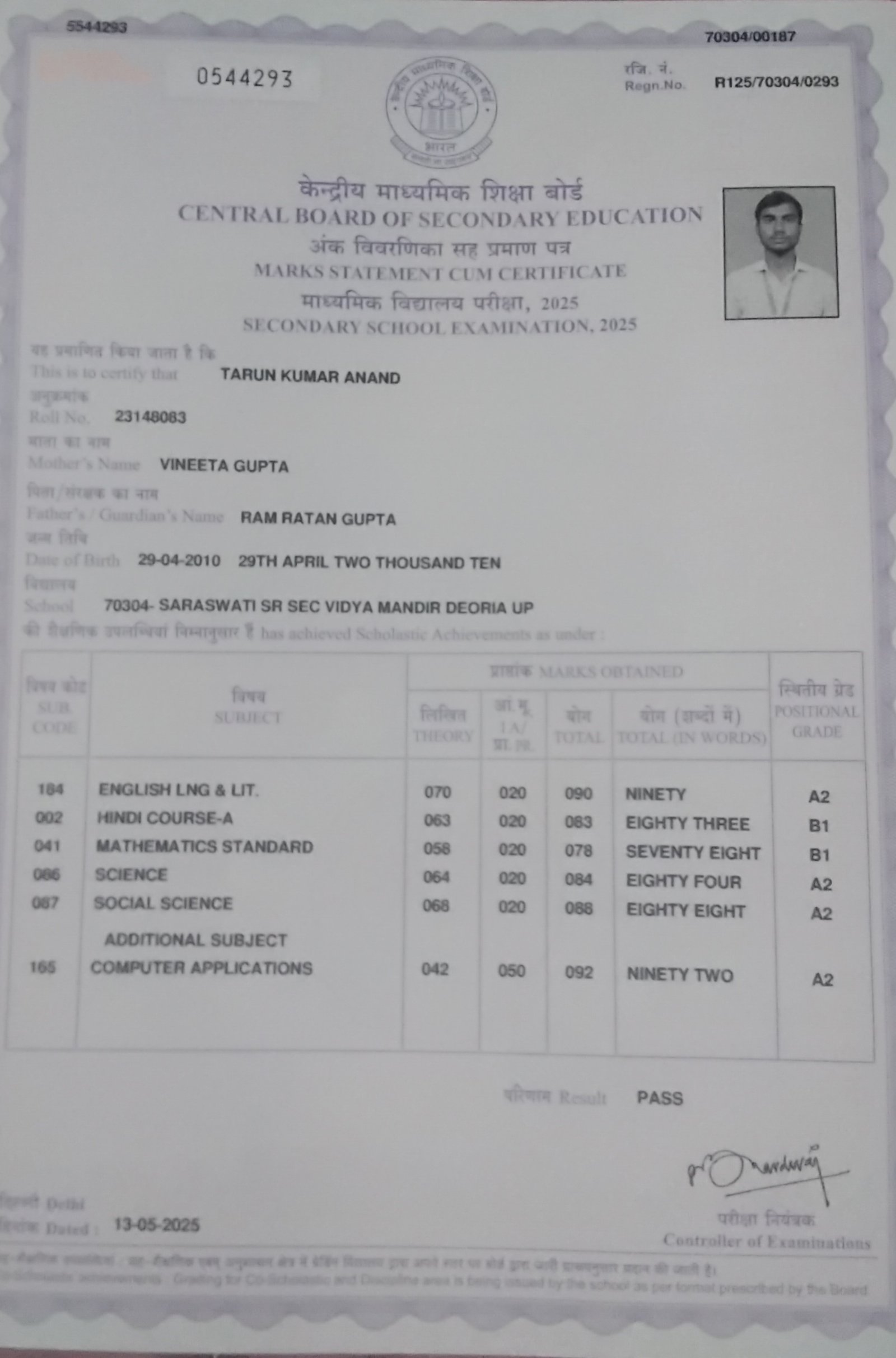 | Father's Name | Ram Ratan Gupta | Gender | Male | Date of Birth | 29-04-2010 |