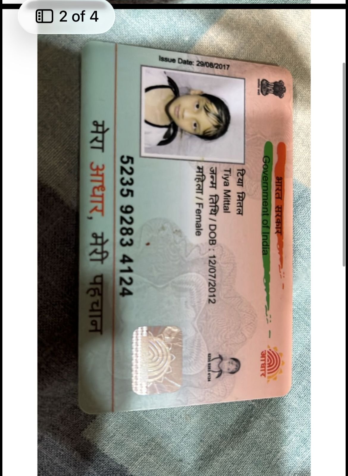 | Father's Name | Amit Kumar Mittal | Gender | Female | Date of Birth | 12-07-2012 |