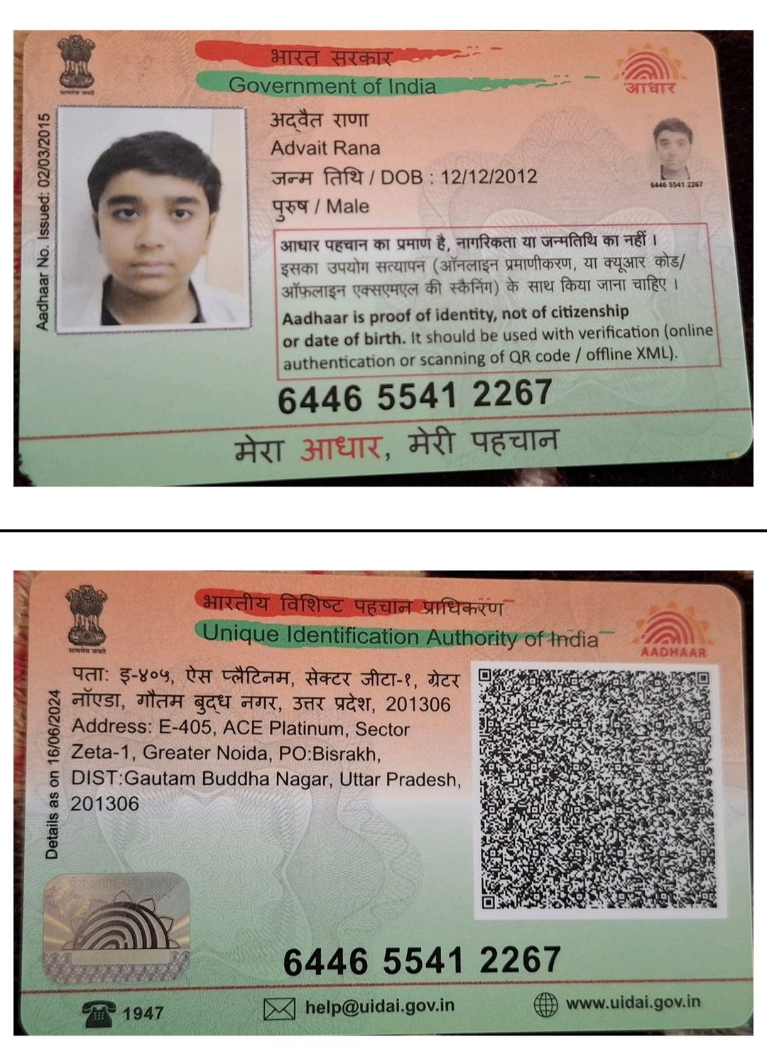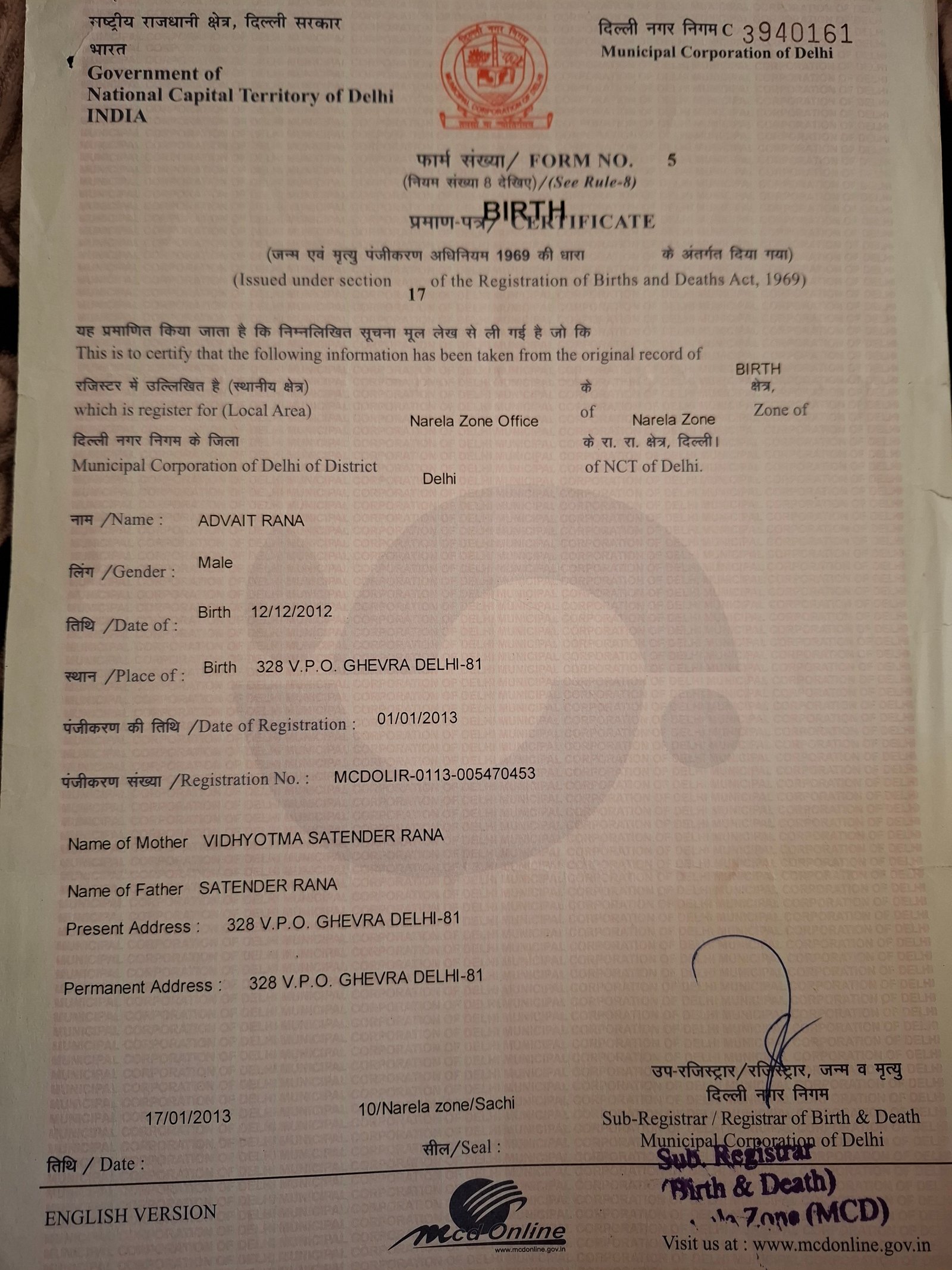 | Father's Name | Satender Rana | Gender | Male | Date of Birth | 12-12-2012 |