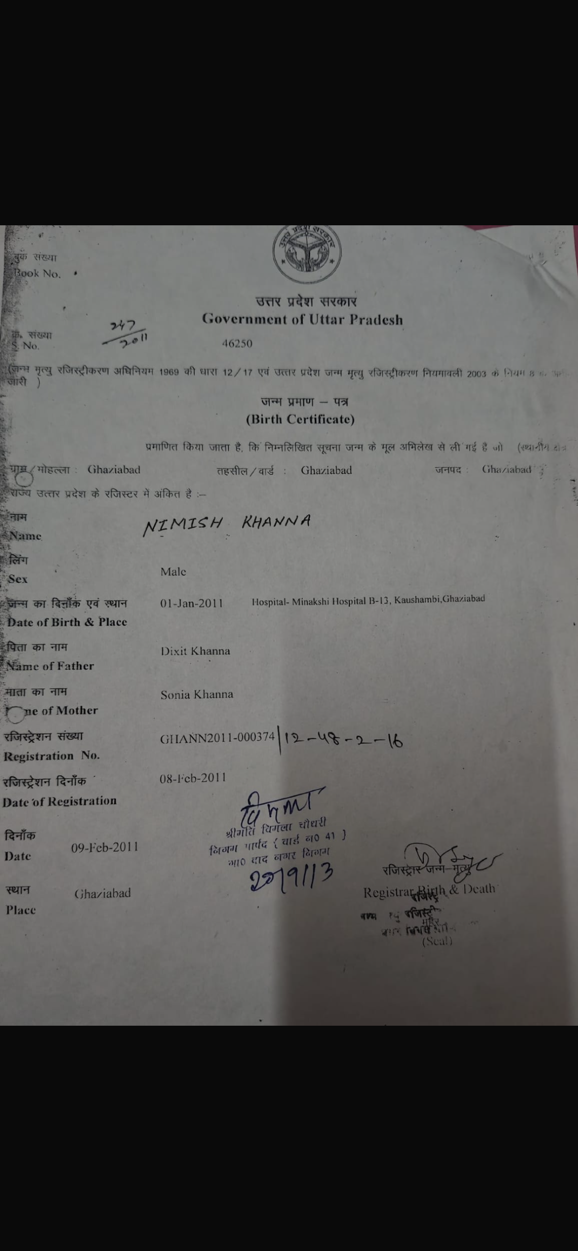 | Father's Name | Dixit khanna | Gender | Male | Date of Birth | 01-01-2011 |