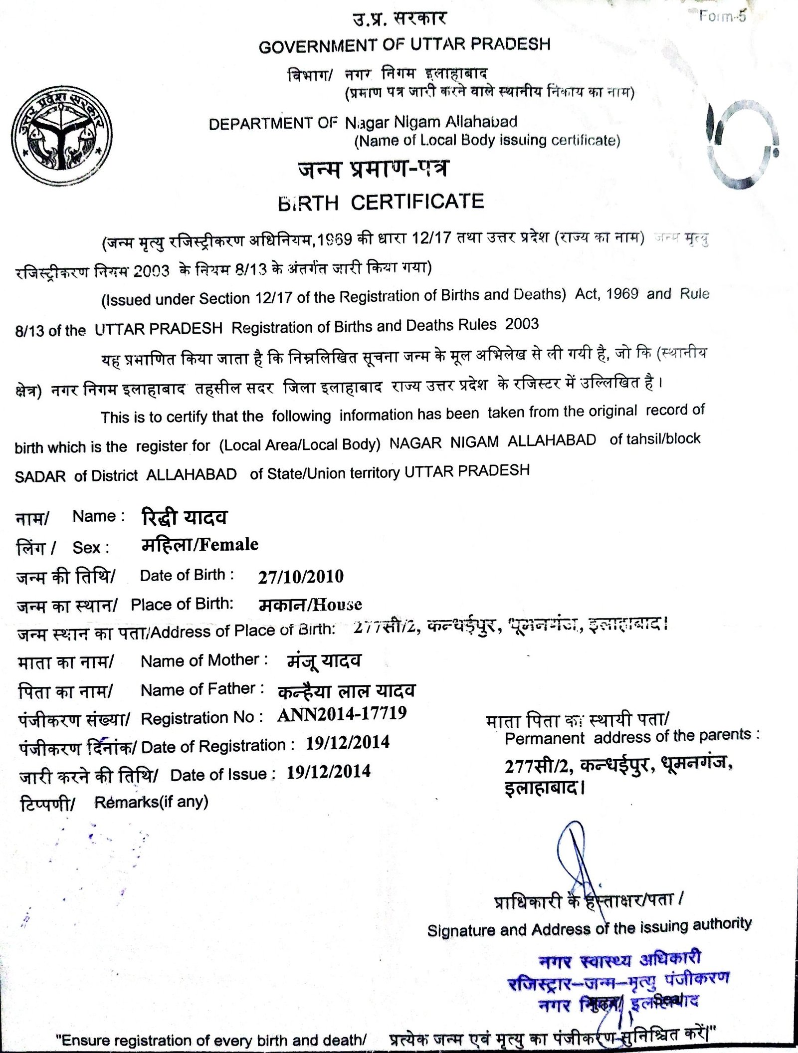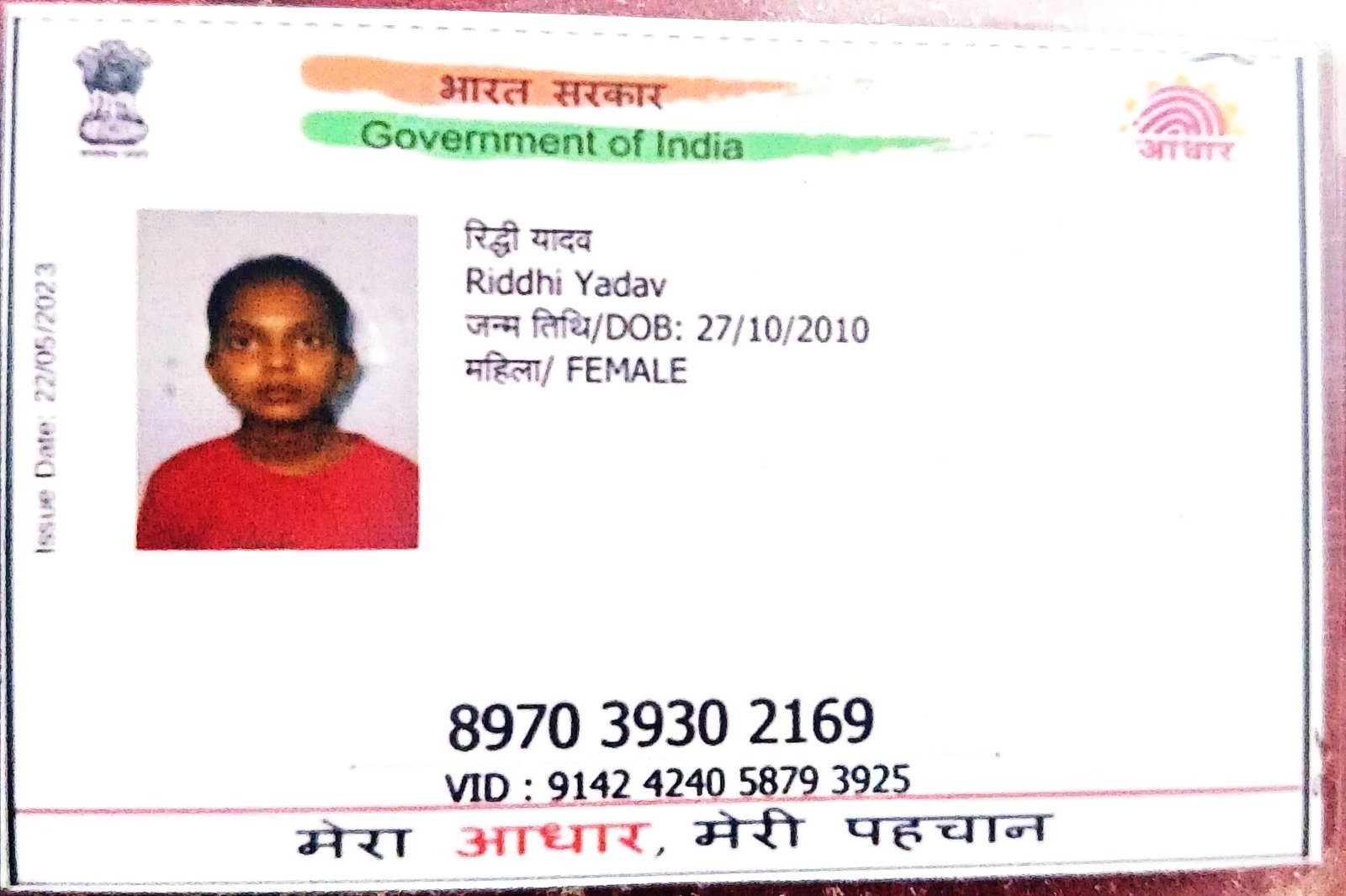 | Father's Name | Kanhaiya Lal Yadav | Gender | Female | Date of Birth | 27-10-2010 |