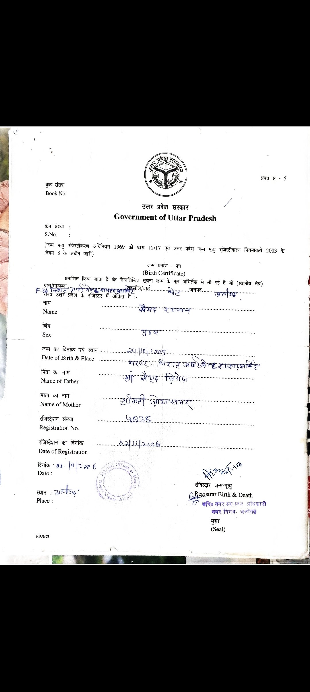 | Father's Name | SEYD FIROZ | Gender | Male | Date of Birth | 24-10-2005 |
