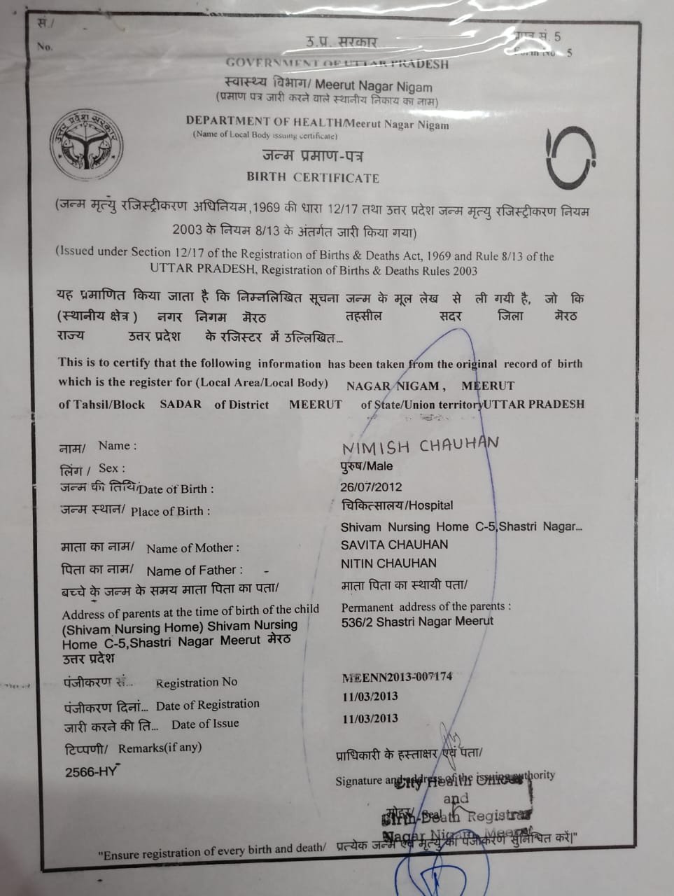 | Father's Name | Nitin Chauhan | Gender | Male | Date of Birth | 26-07-2012 |