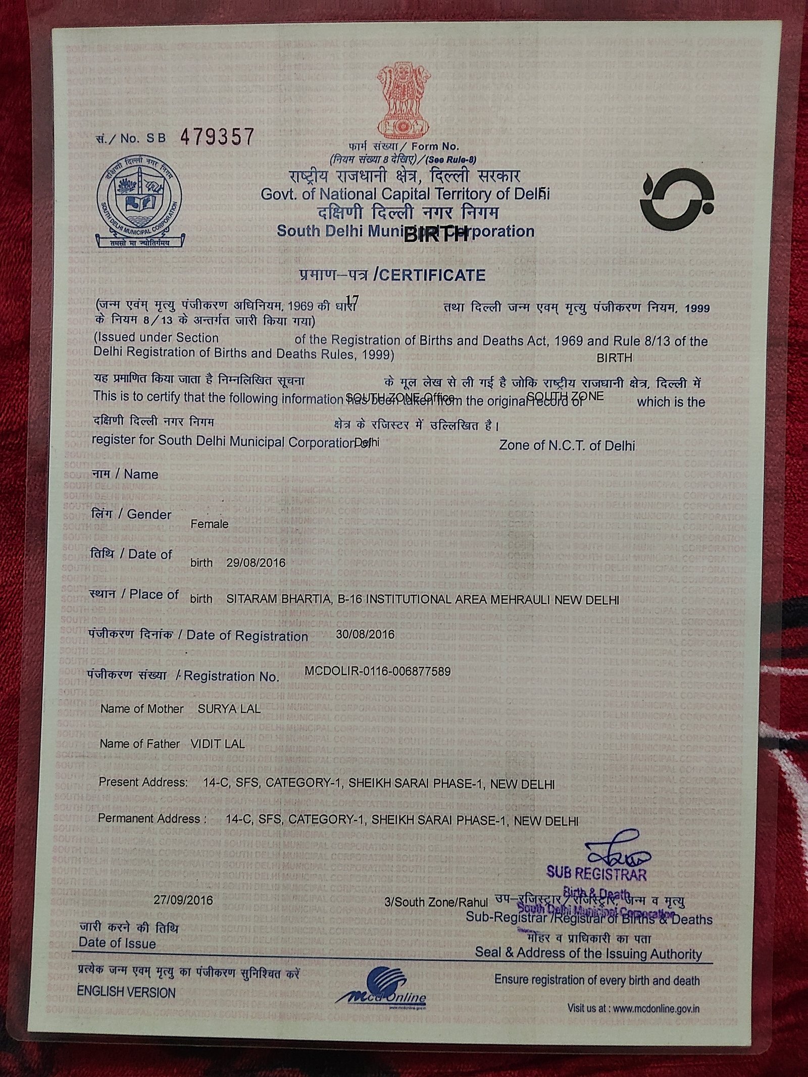 | Father's Name | Vidit Lal | Gender | Female | Date of Birth | 29-08-2016 |