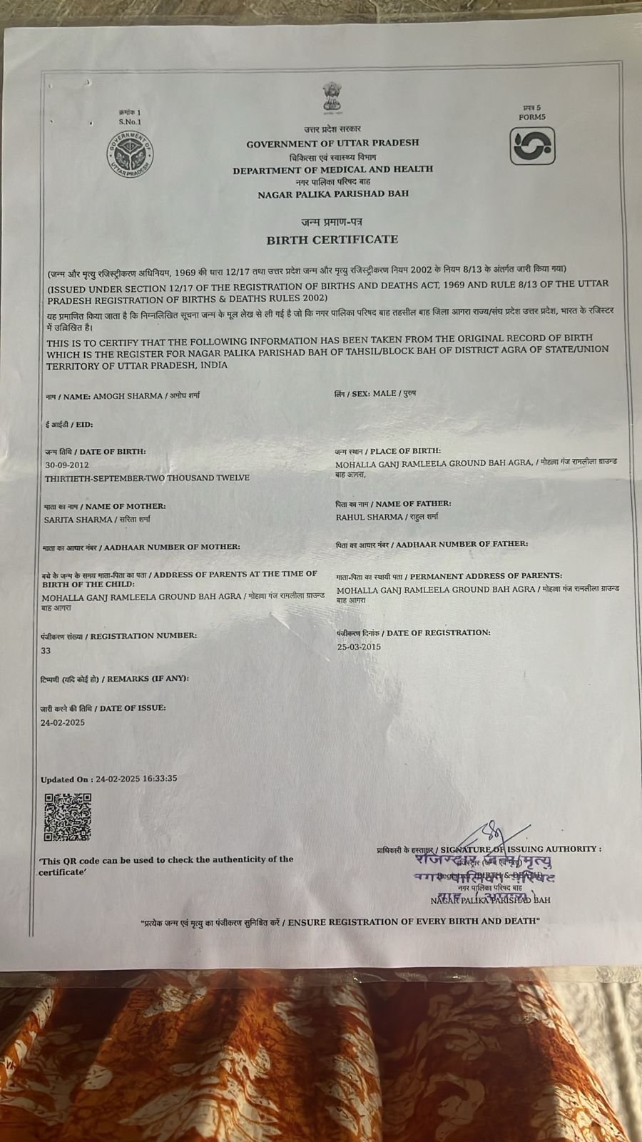 | Father's Name | Mr. Rahul sharma | Gender | Male | Date of Birth | 30-09-2013 |