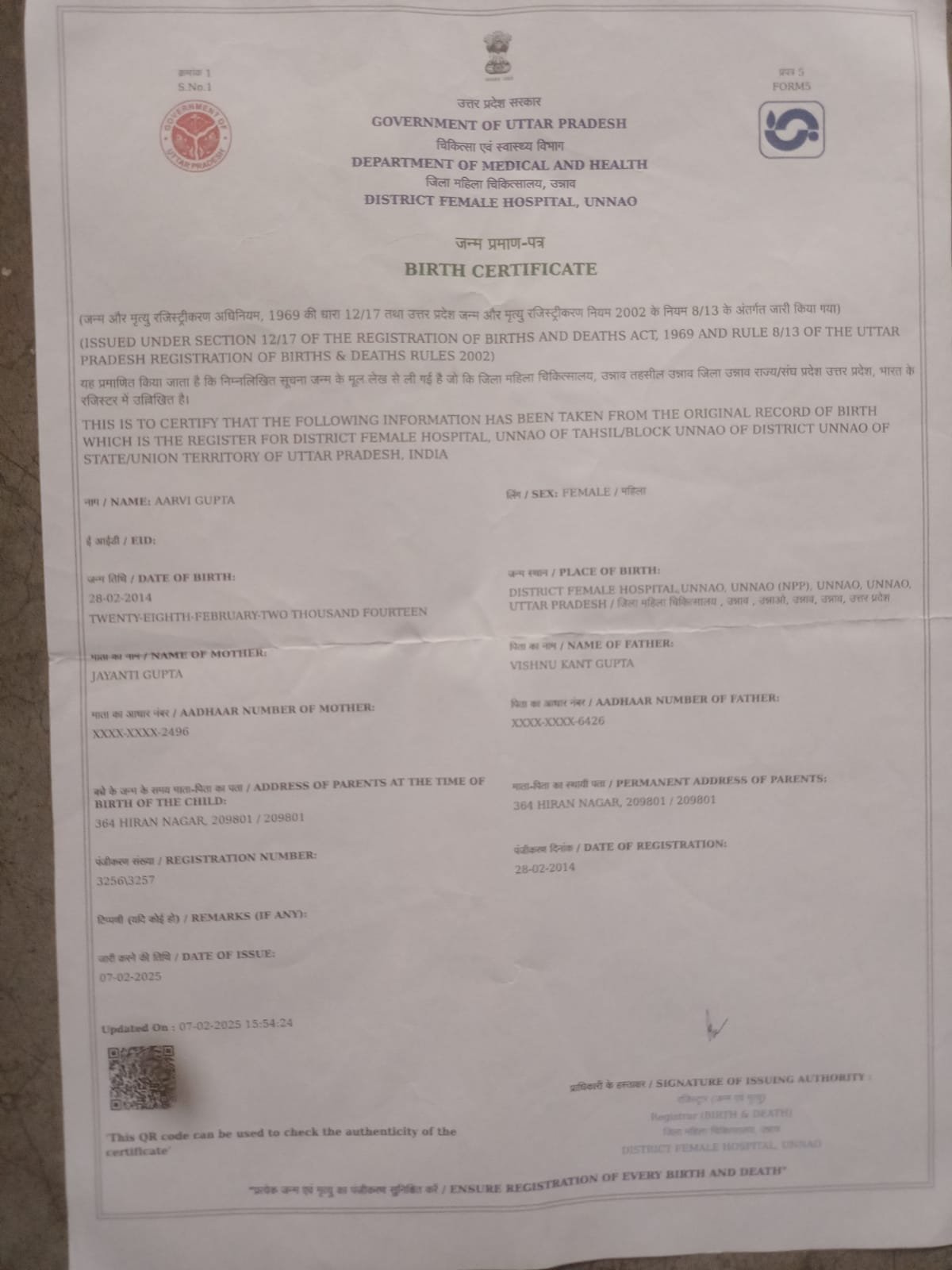 | Father's Name | Vishnu Gupta | Gender | Female | Date of Birth | 28-02-2014 |