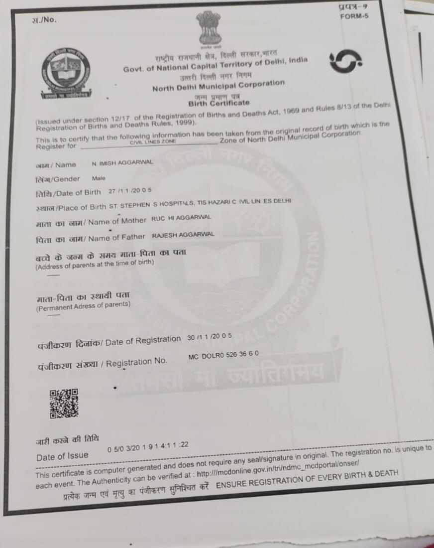 | Father's Name | Rajesh Aggarwal | Gender | Male | Date of Birth | 27-11-2005 |