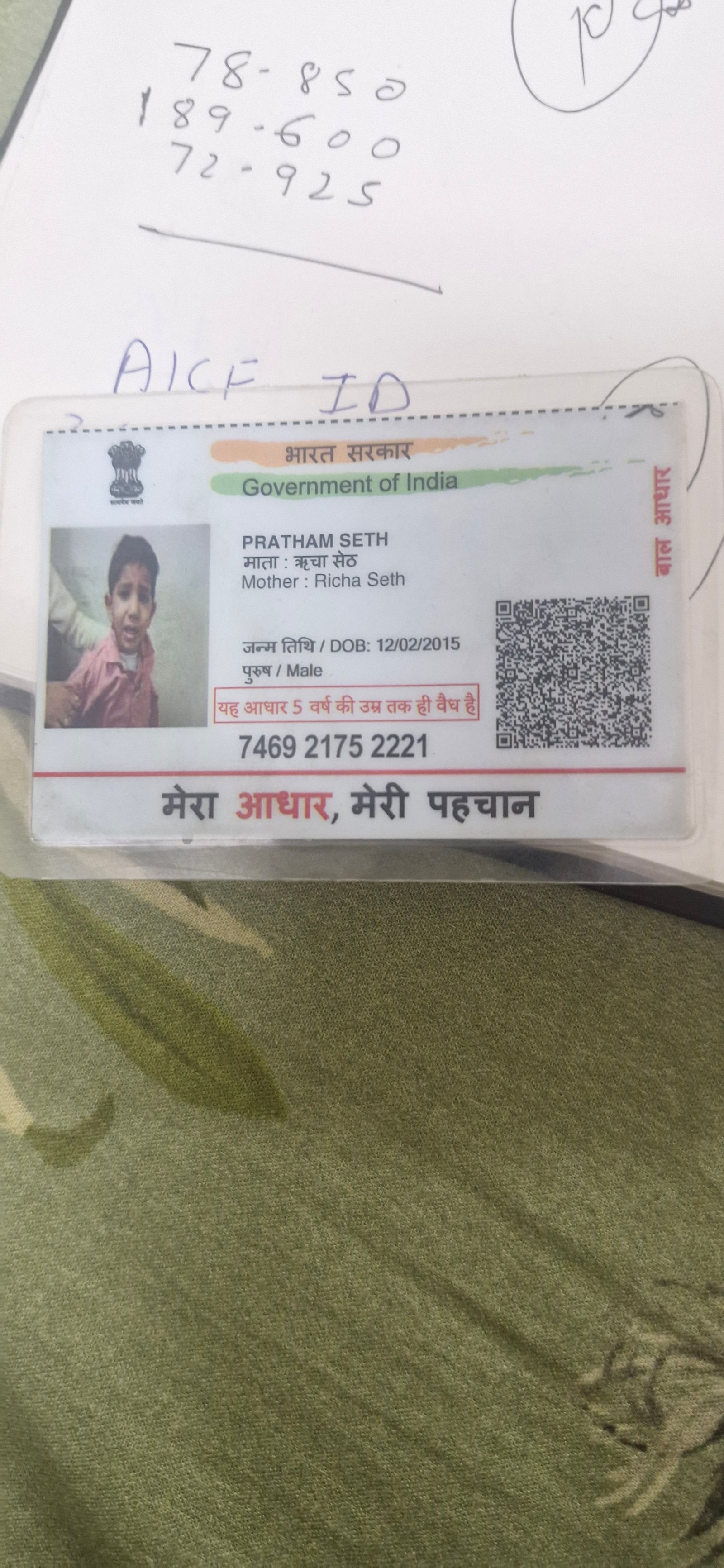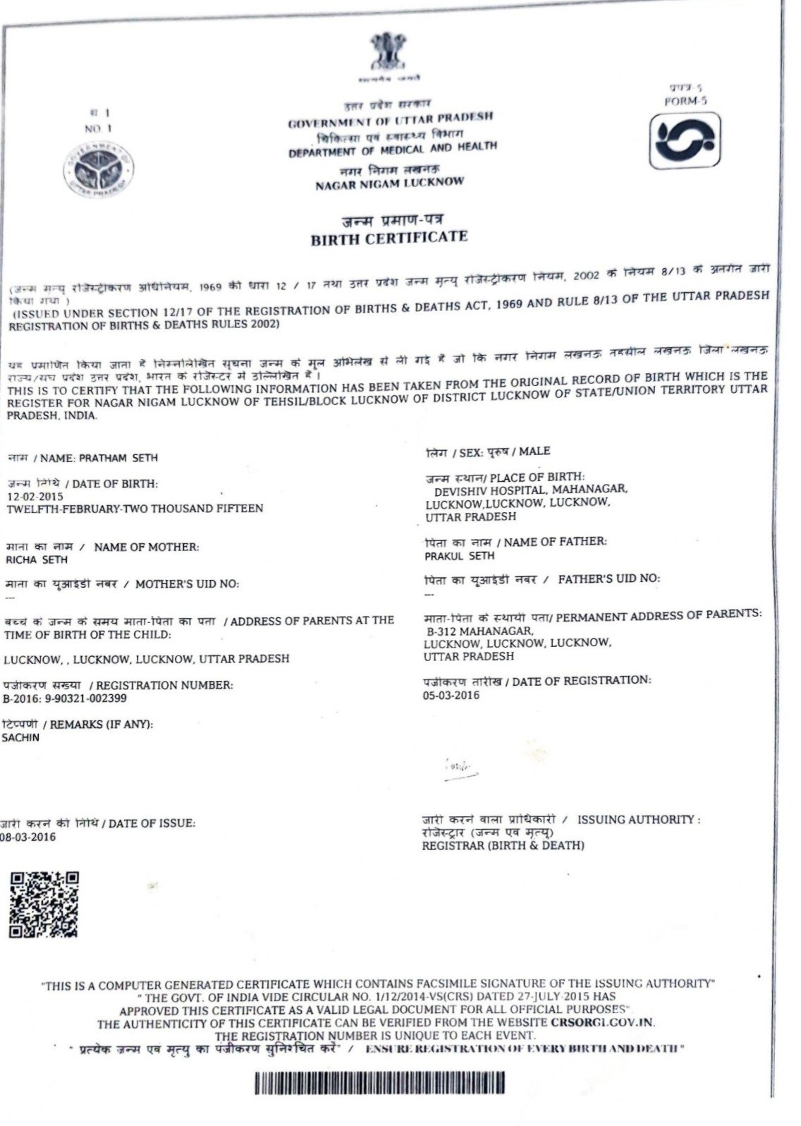| Father's Name | Mr. Prakul Seth | Gender | Male | Date of Birth | 12-02-2015 |