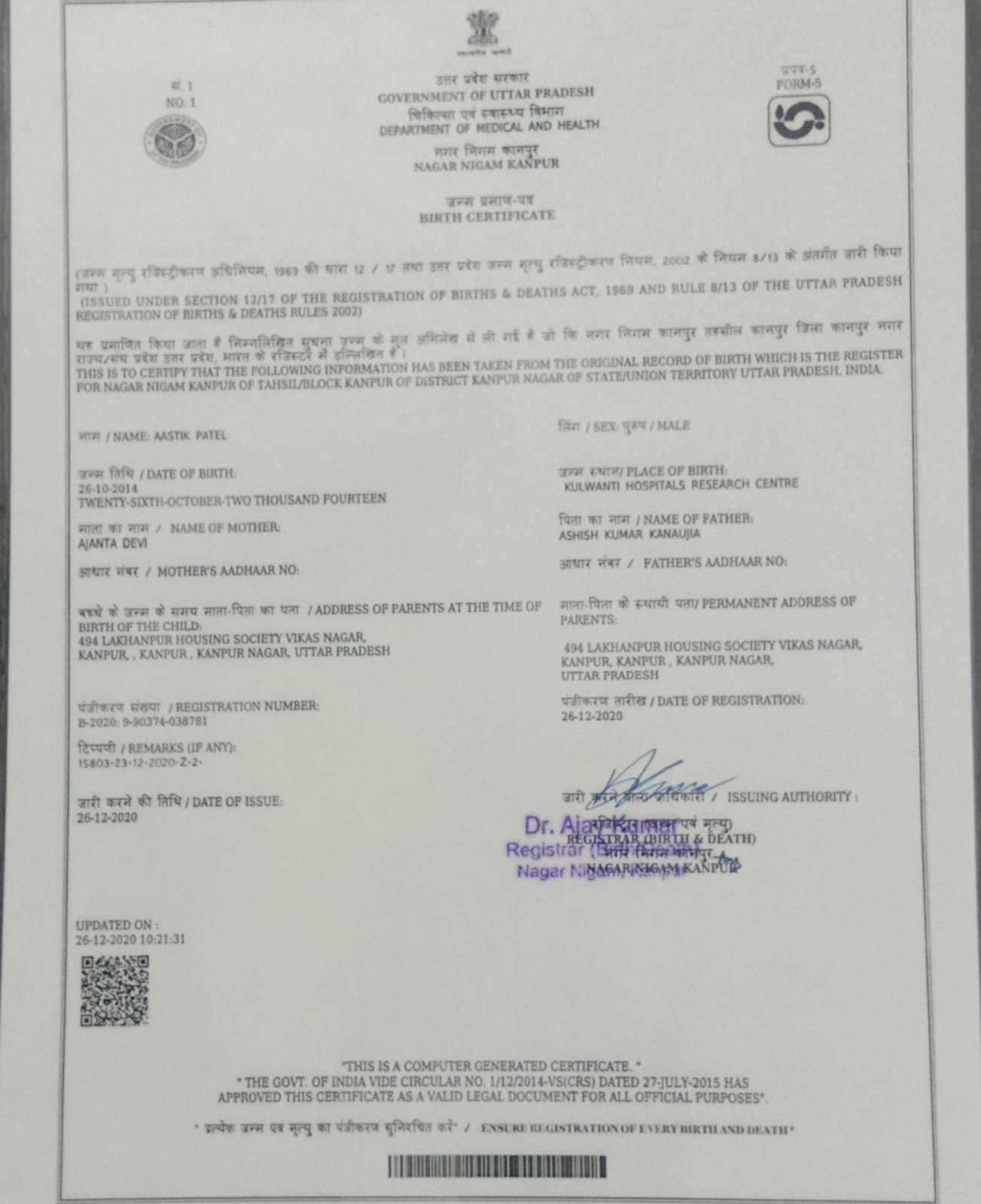 | Father's Name | Ashish Kumar Kanaujia | Gender | Male | Date of Birth | 26-10-2014 |