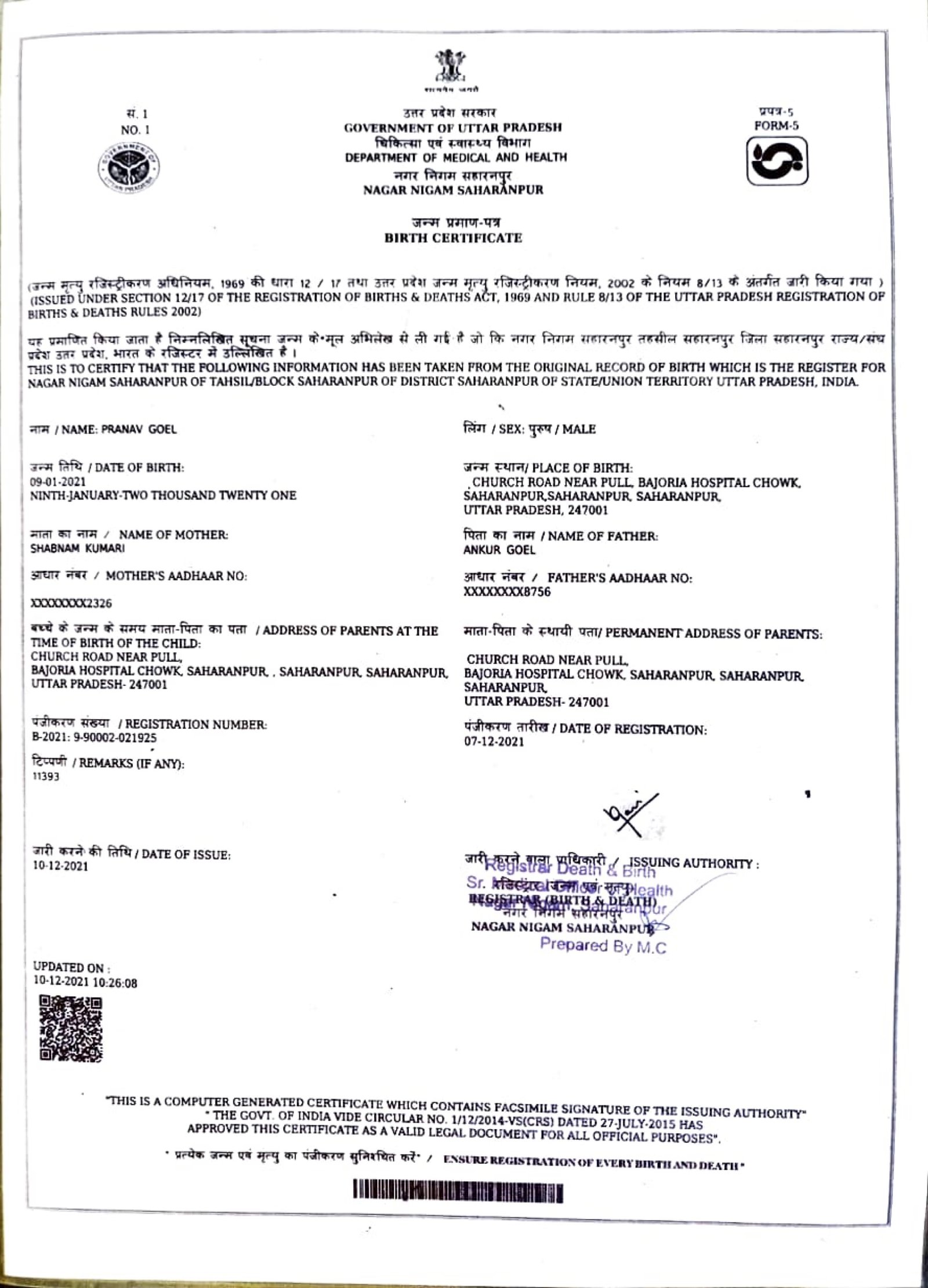 | Father's Name | Ankur Goel | Gender | Male | Date of Birth | 01-01-2021 |