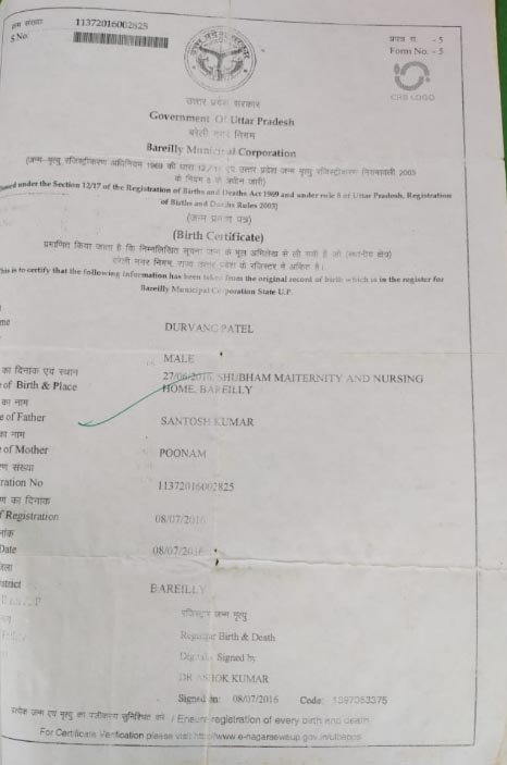 | Father's Name | SANTOSH PATEL | Gender | Male | Date of Birth | 27-06-2016 |
