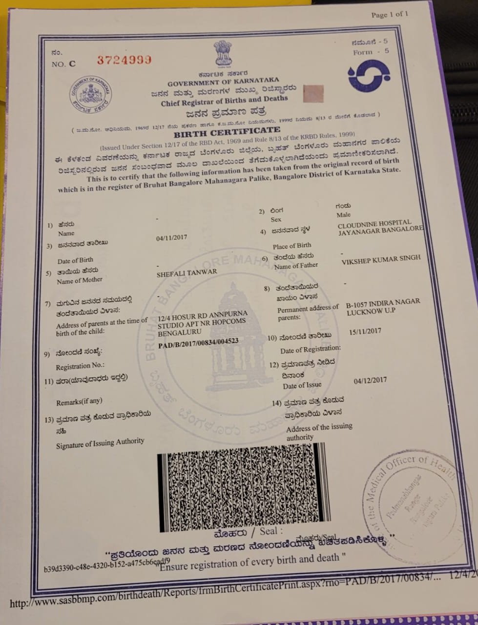 | Father's Name | Vikshep singh | Gender | Male | Date of Birth | 04-11-2017 |