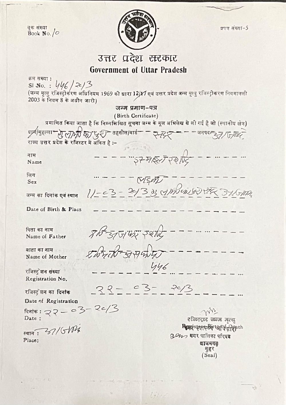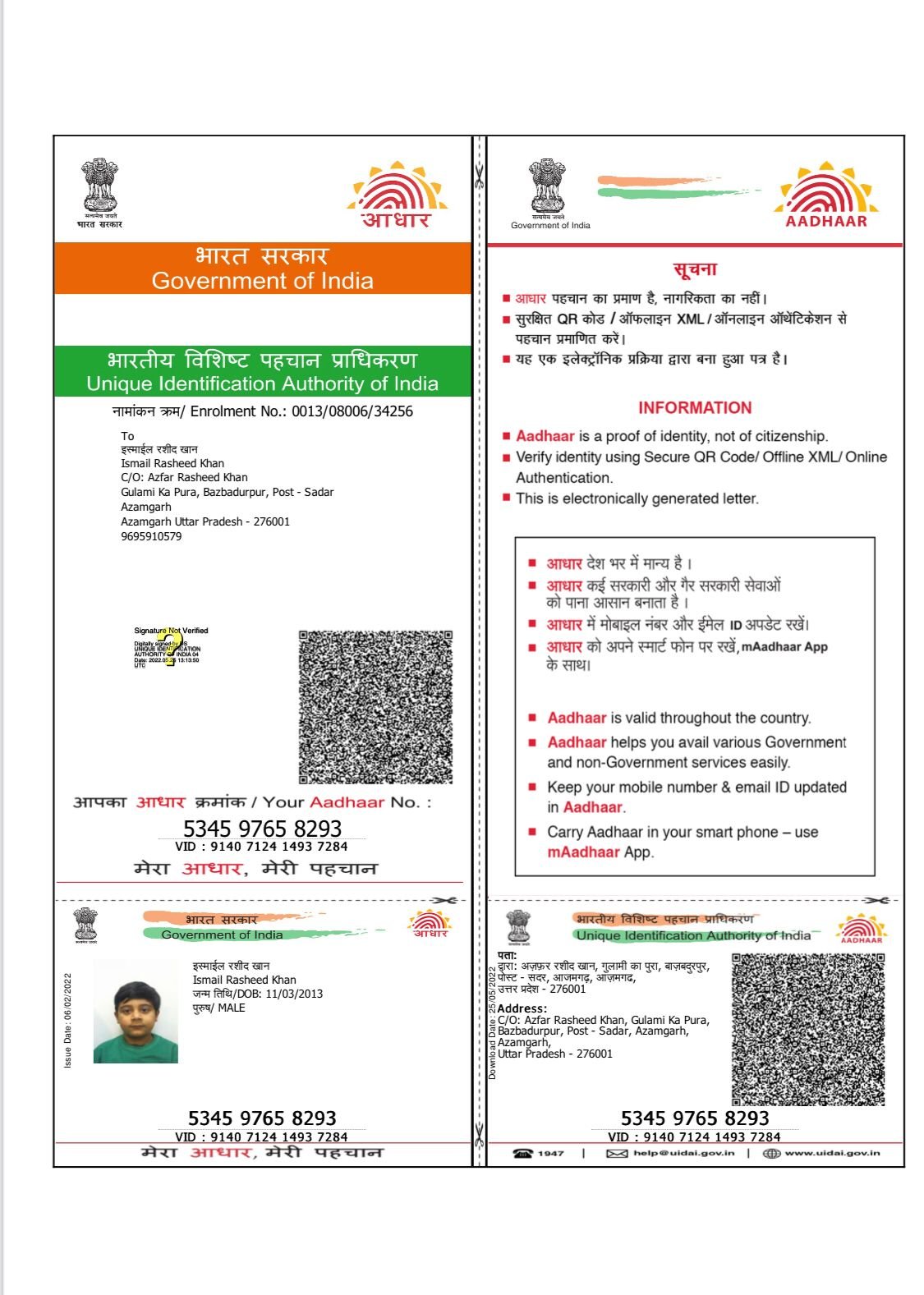 | Father's Name | Azfar Rasheed Khan | Gender | Male | Date of Birth | 11-03-2013 |