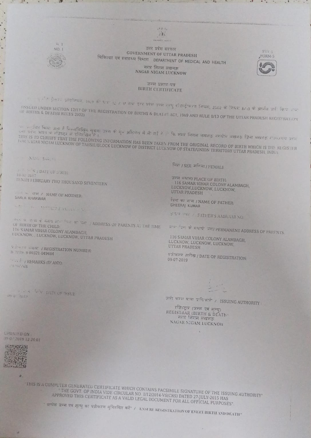 | Father's Name | DHEERAJ KUMAR | Gender | Female | Date of Birth | 02-10-2017 |