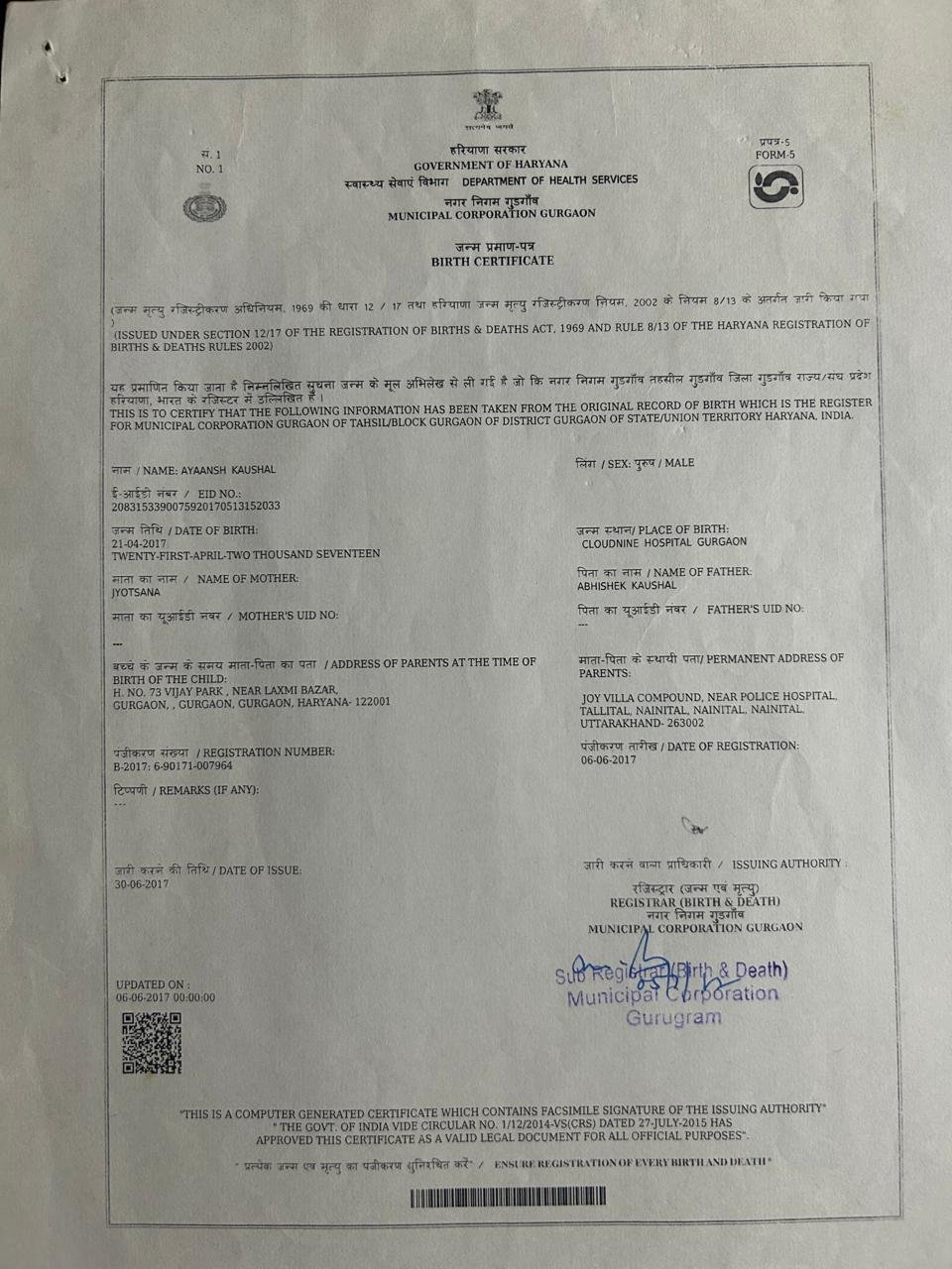 | Father's Name | Abhishek Kaushal | Gender | Male | Date of Birth | 21-04-2017 |