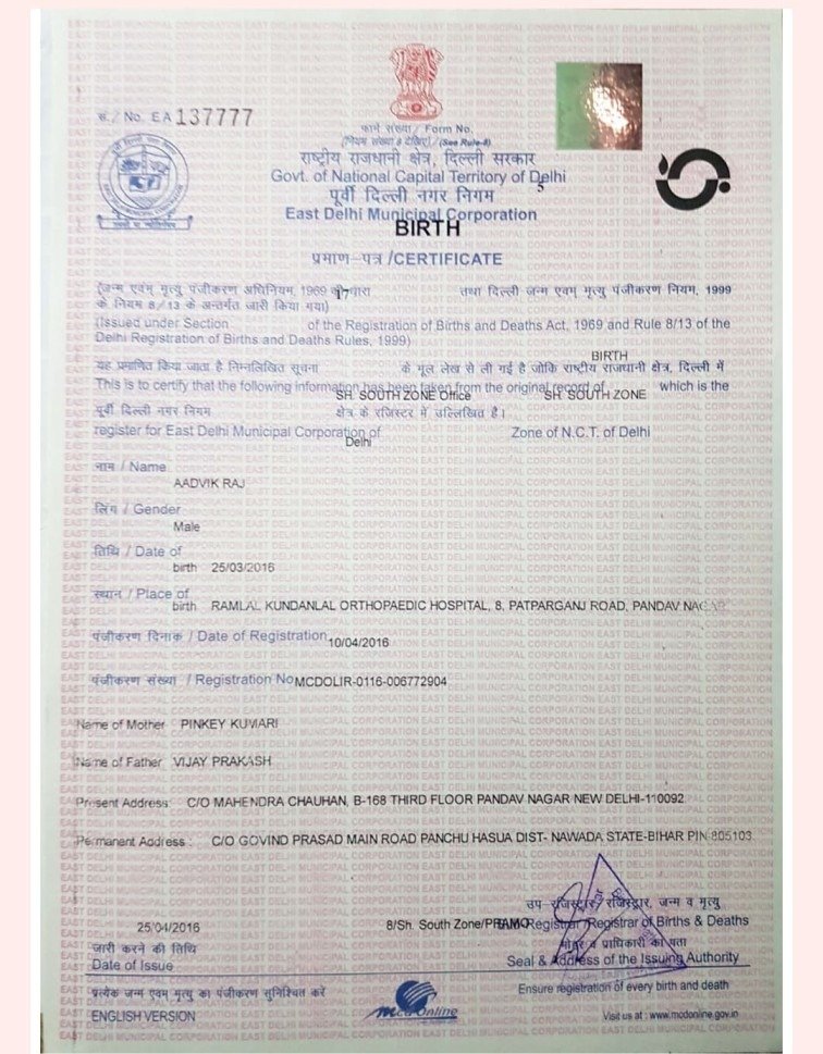 | Father's Name | Vijay Prakash | Gender | Male | Date of Birth | 25-03-2016 |