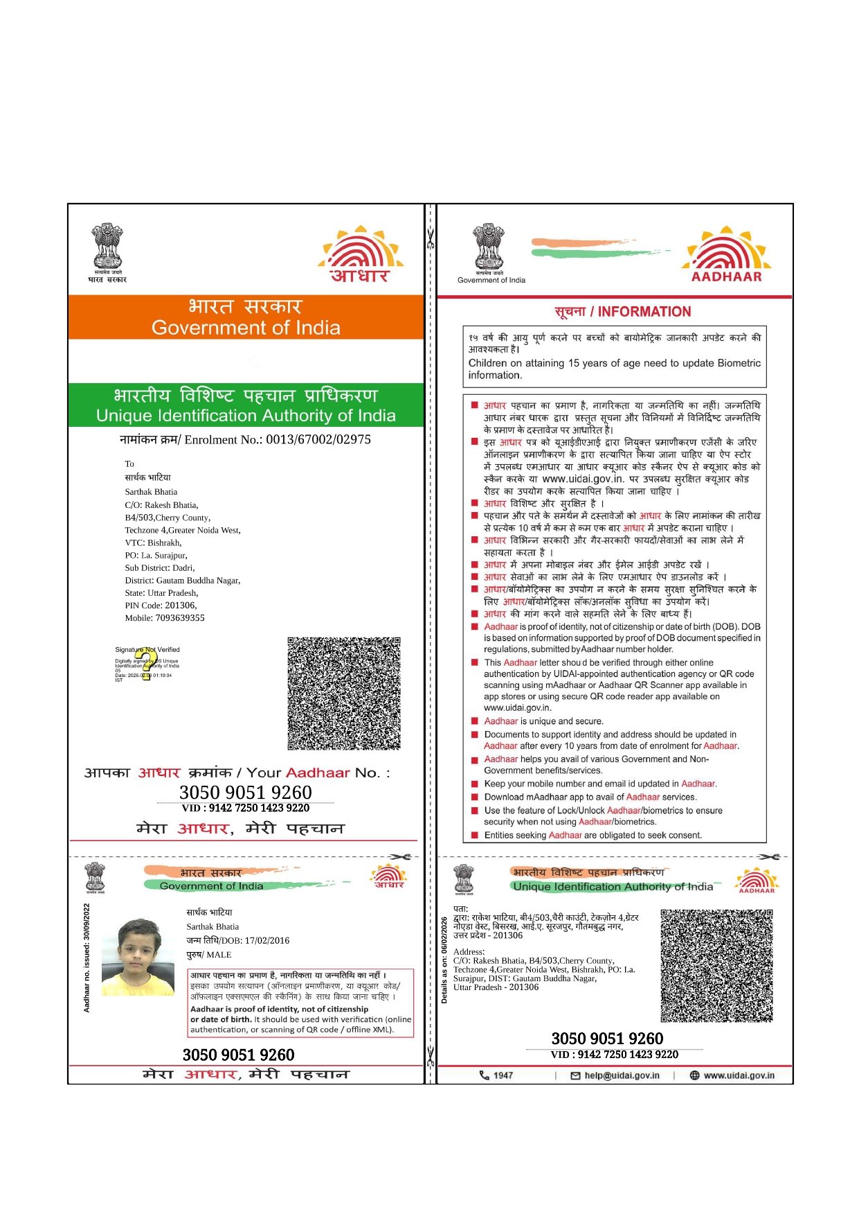 | Father's Name | RAKESH BHATIA | Gender | Male | Date of Birth | 17-02-2016 |
