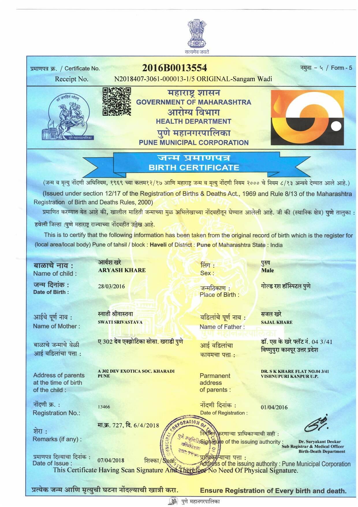 | Father's Name | Sajal khare | Gender | Male | Date of Birth | 28-03-2016 |