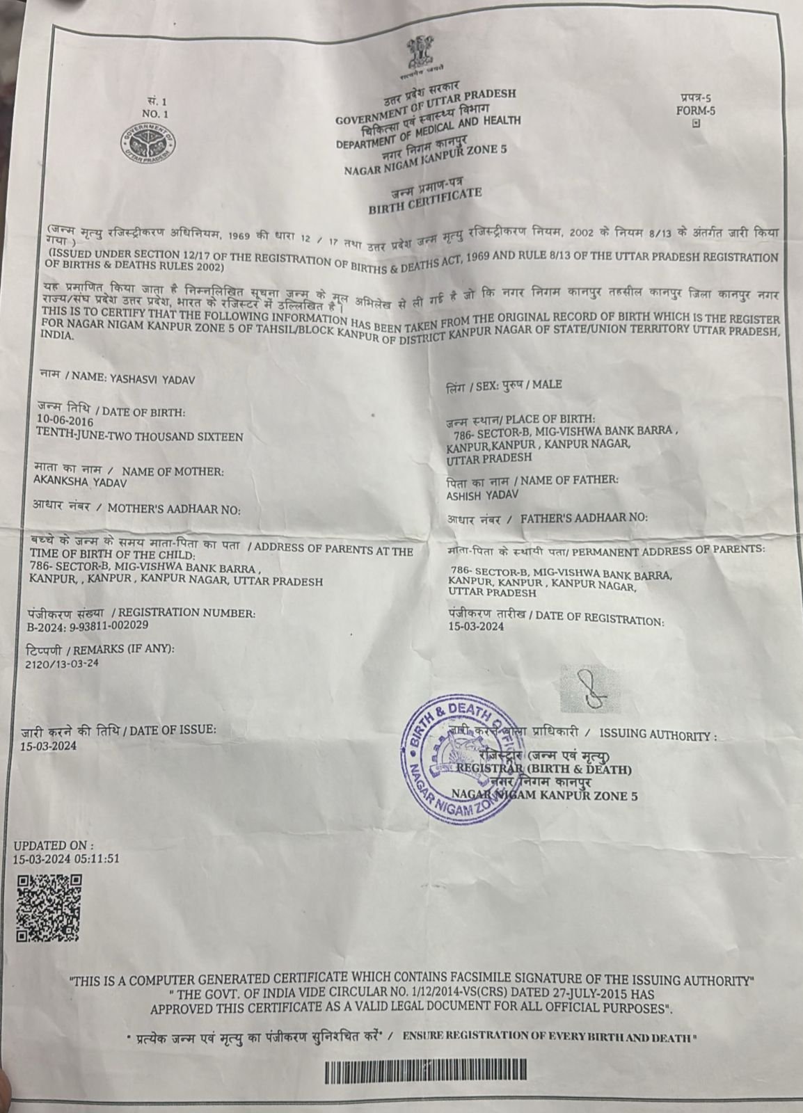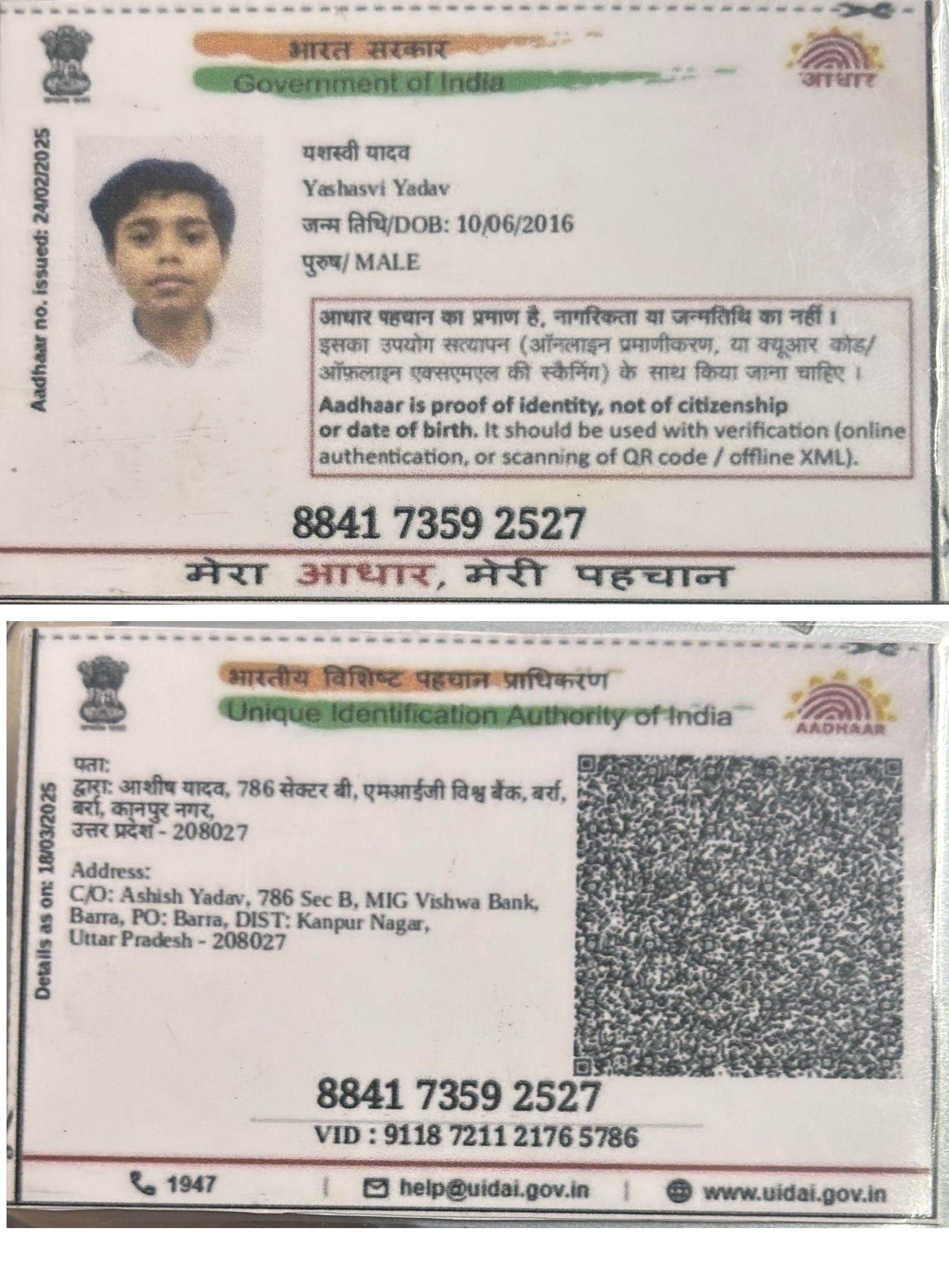 | Father's Name | ASHISH YADAV | Gender | Male | Date of Birth | 10-06-2016 |