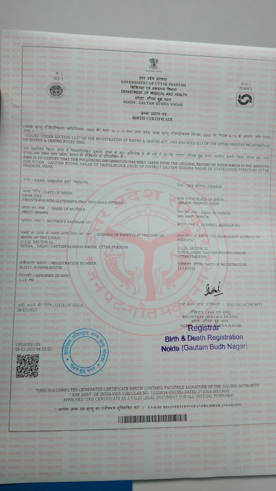 | Father's Name | Umakant Tripathi | Gender | Female | Date of Birth | 24-09-2015 |